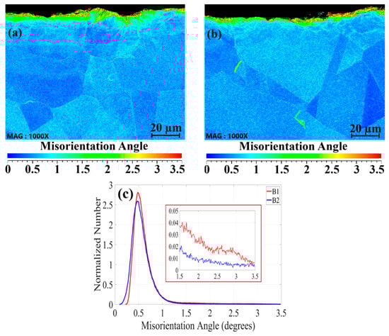 Figure 13 compares the kernel average misorientation (KAM) maps for B1 (40-grit) and B2 (60-grit). The blue-to-red color gradient represents increasing misorientation. The B1 specimen shows higher concentrations of localized strain near the surface, corroborated by the normalized misorientation distribution (Figure 13c). This trend confirms that rougher surface preparation promotes more deformation-induced strain energy.