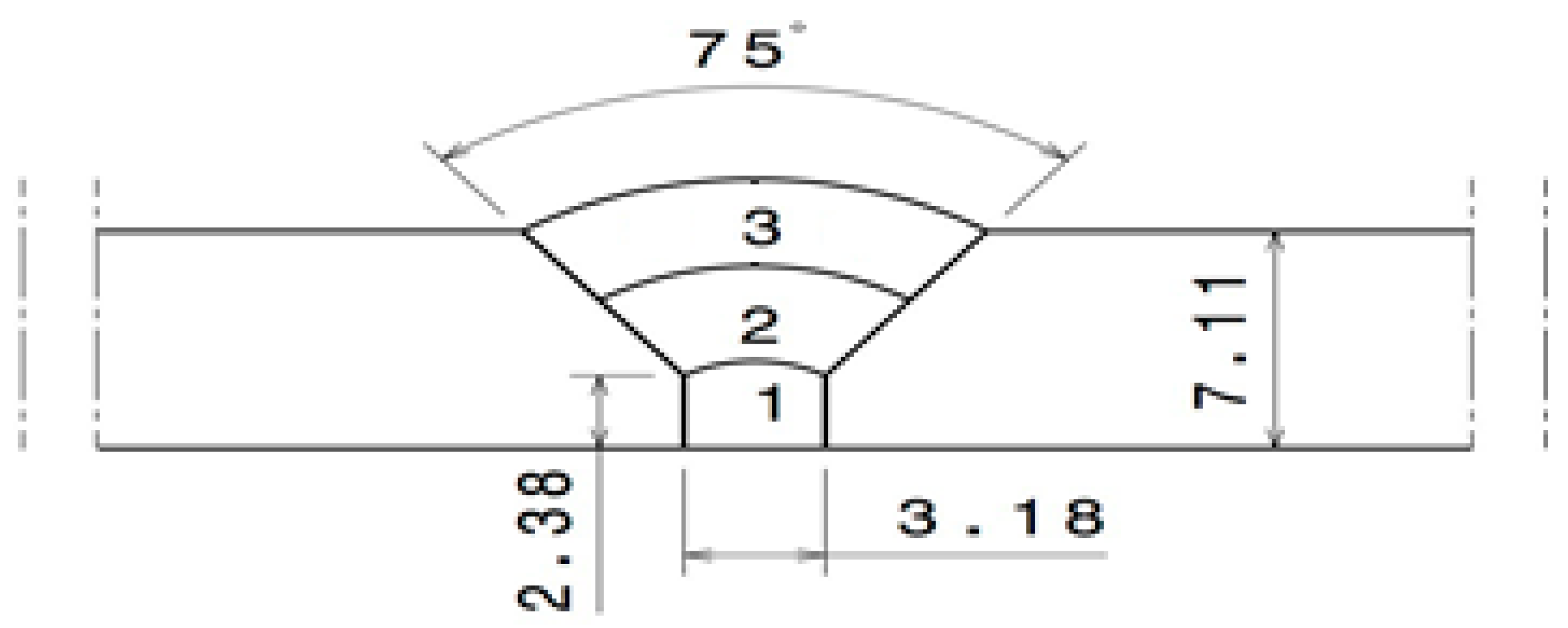 The 316L stainless steel specimens were welded using a hybrid process combining GTAW and FCAW. Argon gas containing controlled oxygen contents (500 or 5000 ppm) was employed to purge the interior of each pipe. The root pass was deposited by GTAW, followed by two FCAW passes for filling, resulting in a total of three welding passes per specimen. The geometry of the welded joint is illustrated in Figure 2.