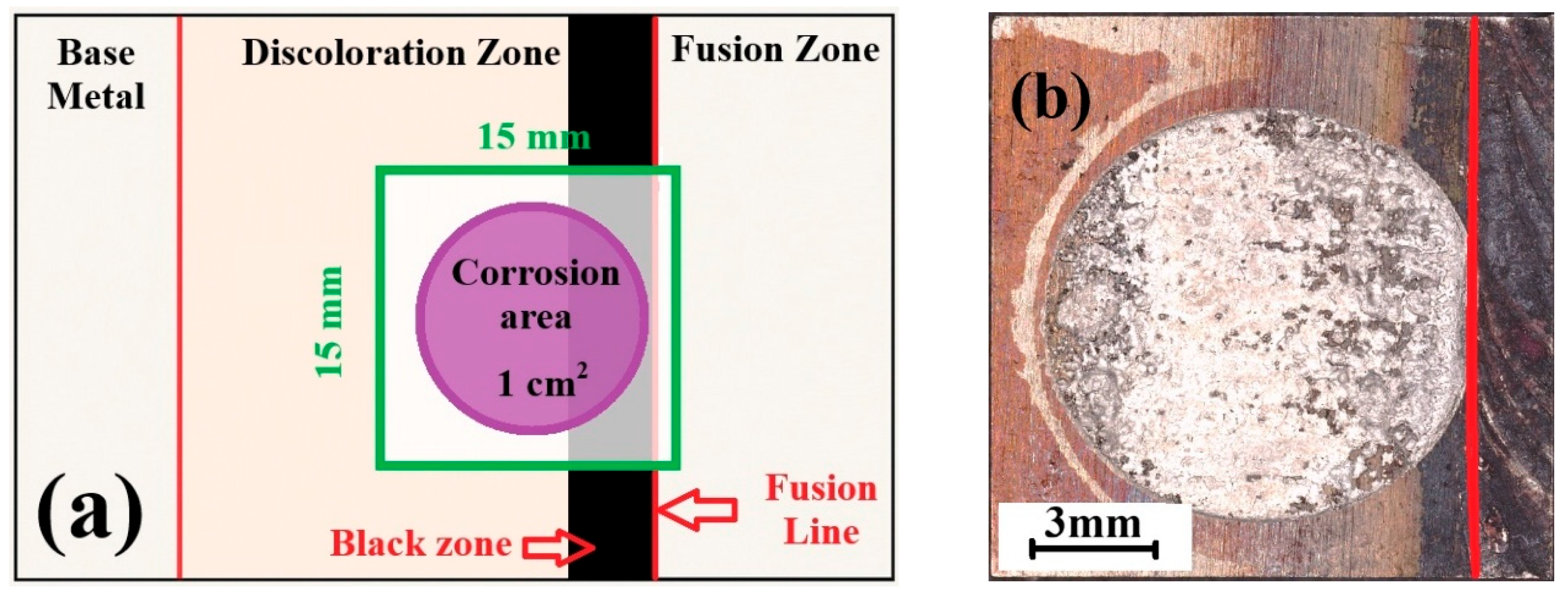 - Kim, B.; Lee, C.; Kim, J.; Lee, J. Corrosion Assessment and Quantification of Discoloration in the Weld Root Bead and Heat-Affected Zone of Stainless Steel Pipe Weldments. In Proceedings of the ISOPE International Ocean and Polar Engineering Conference, Rhodes, Greece, 16–21 June 2024; ISOPE: Mountain View, CA, USA, 2024. [Google Scholar]