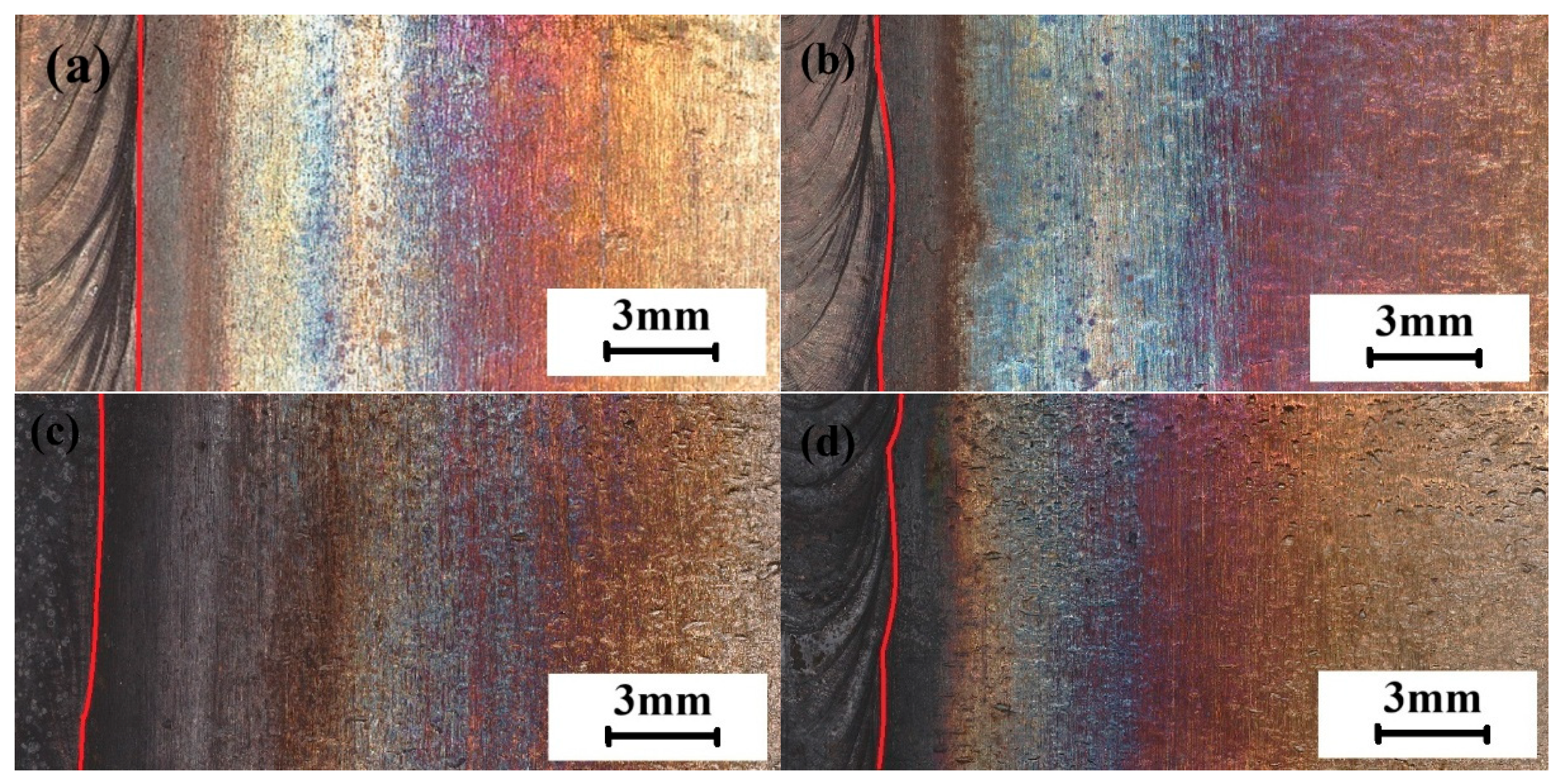 Discoloration of oxide layers (the red lines indicate the fusion line): (a) 500 ppm, B1; (b) 500 ppm, B2; (c) 5000 ppm, B1; (d) 5000 ppm, B2.
