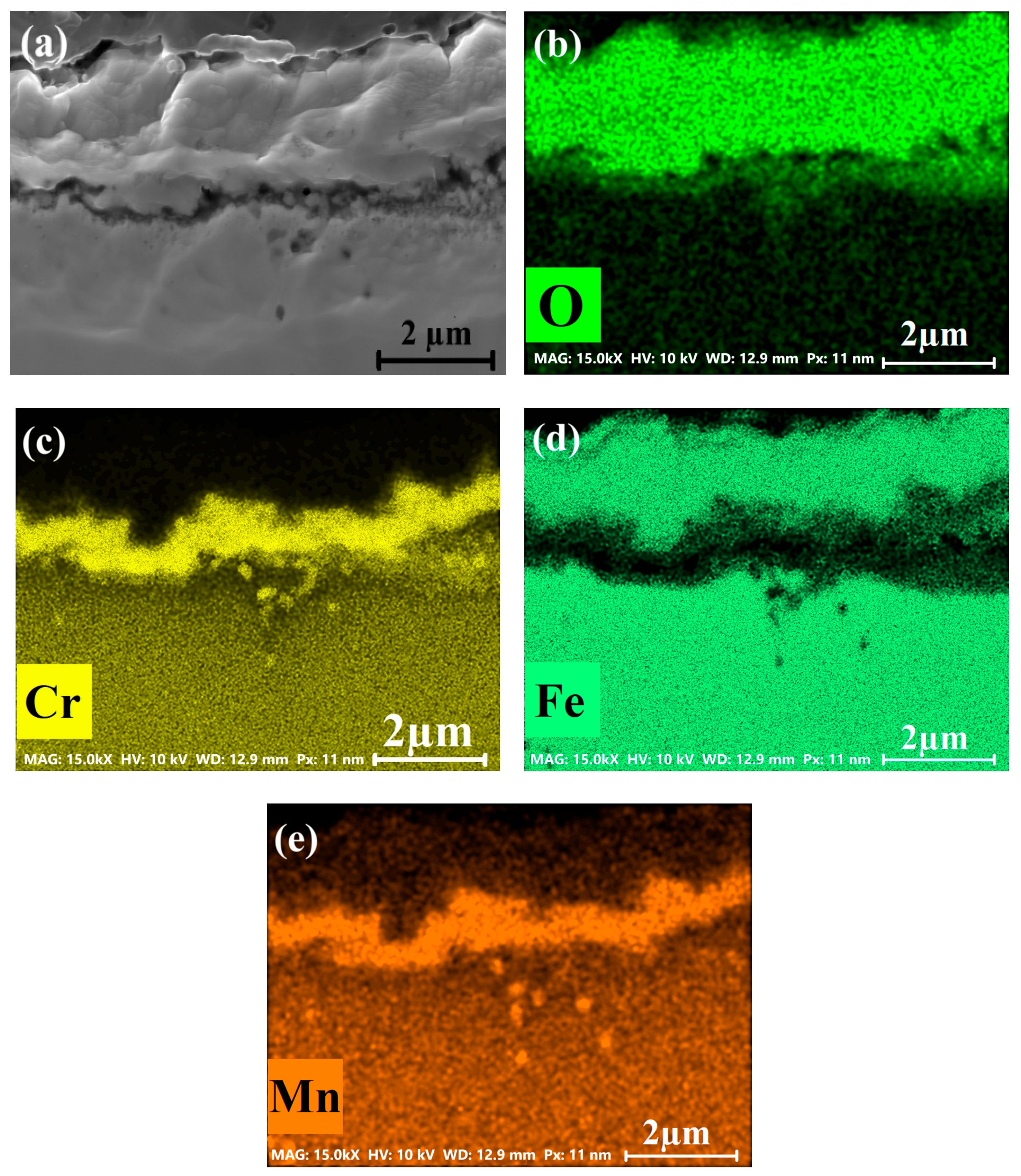 Behind the grain boundaries, the elemental maps show a notable enrichment of oxygen. This was attributed to the diffusion of oxygen into the material’s bulk during the high-temperature exposure. However, in these regions, the availability of Cr is limited due to its preferential segregation to the grain boundaries, as seen in the microstructural analysis of the subsurface layers, reported in Figure 16. The Cr-depleted zones beneath the surface observed in Figure 16 further contribute to the inability of oxygen to form Cr oxide in these regions. Consequently, oxygen enrichment occurs in areas behind the grain boundaries where no protective oxide formation can occur, leading to potential vulnerability to localized oxidation or corrosion.