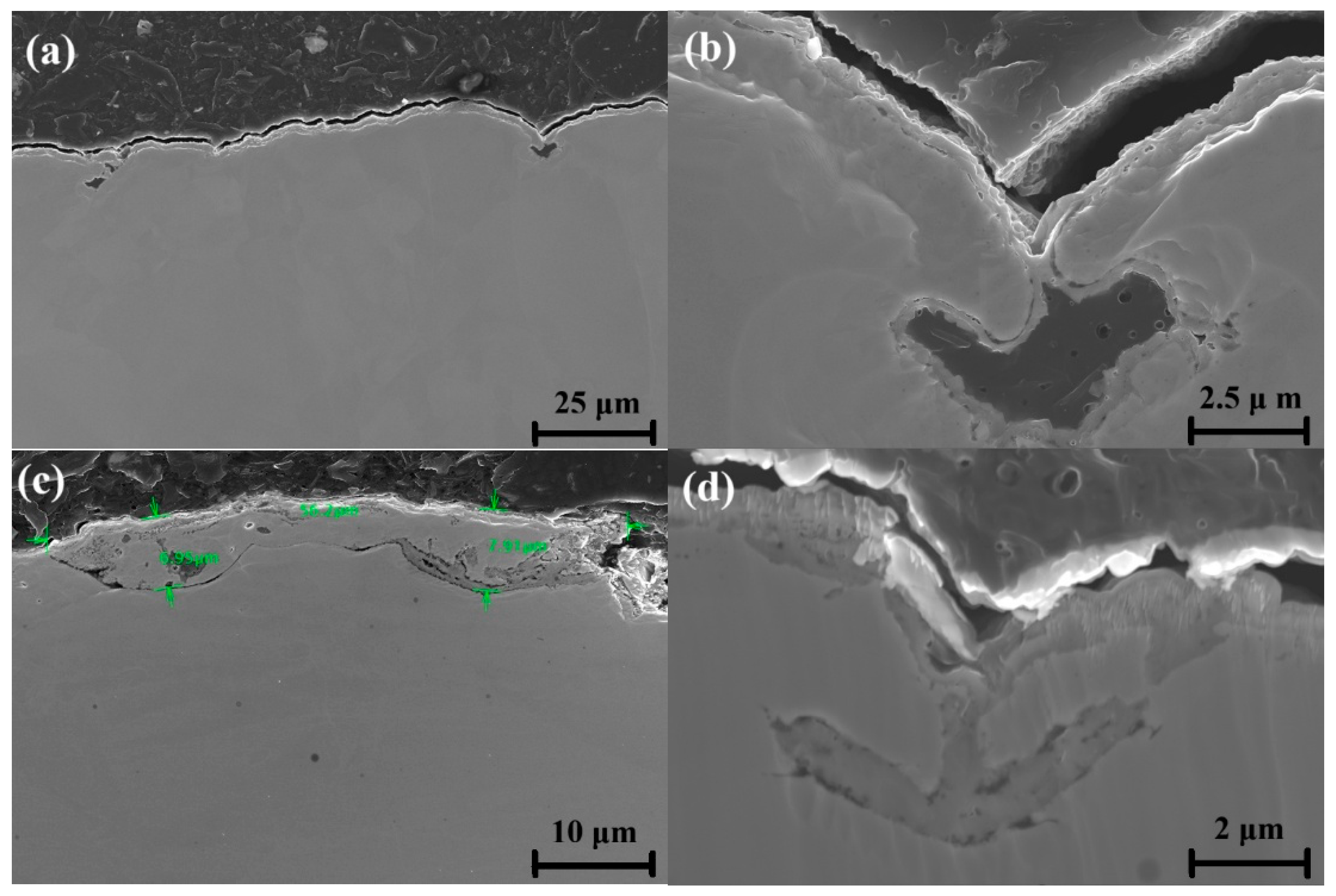 Figure 9 illustrates surface oxidation features likely associated with pre-existing surface imperfections from machining or forming. These features acted as preferential oxidation sites during welding, and their evolution differed significantly between the 500 ppm and 5000 ppm conditions. At the lower oxygen level, oxidation remained localized within surface cavities, producing a thin oxide with limited lateral growth (Figure 9a,b). At 5000 ppm oxygen content, oxidation is significantly more pronounced, with greater propagation beyond the original surface features. This is evident from the thicker oxide layers and more extensive coverage of the material surface. As shown in Figure 9c, oxidation within surface features propagates to a depth of approximately 7 micrometers. This oxidation leads to detachment or delamination of the oxide layer from the underlying metal.