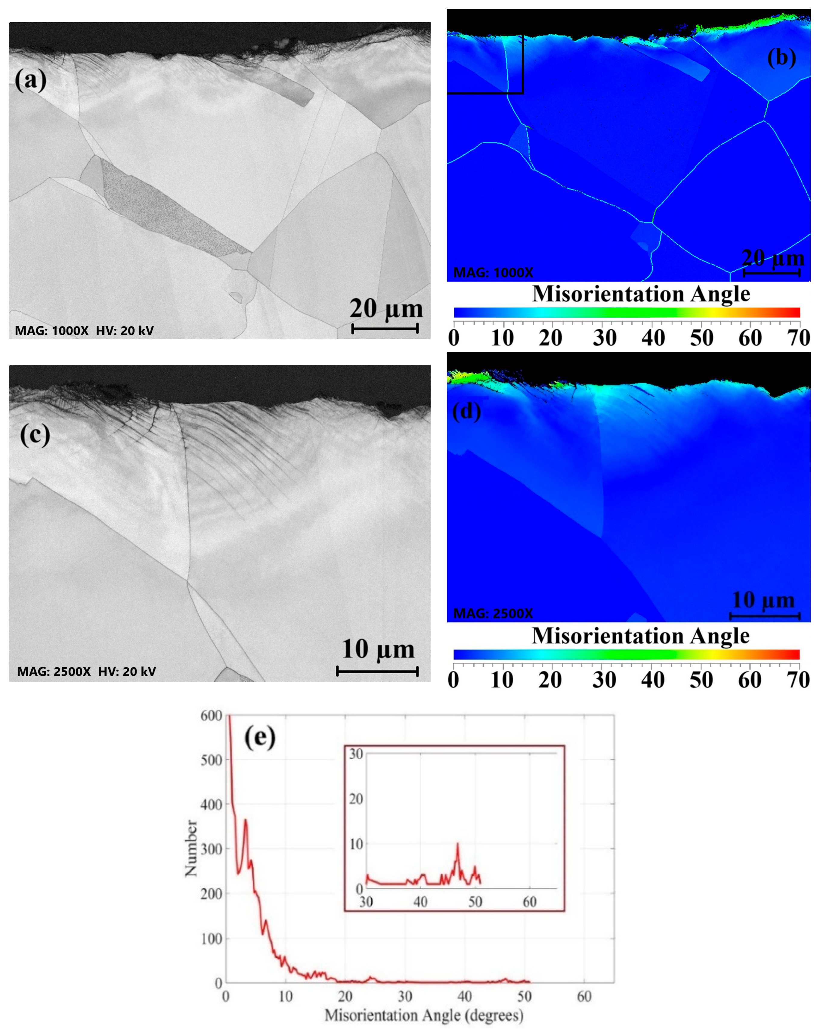 The EBSD analysis of sample B2 (Figure 11) reveals localized misorientation near the surface, reaching up to 50.91°. This misorientation, visible in both the angular misorientation graph and the color-coded EBSD map, reflects strain introduced by the buffing process. The affected zone extends roughly 5 µm beneath the surface, beyond which the grains return to their original orientation and size. Slip bands observed in Figure 11c confirm plastic deformation in the near-surface region.