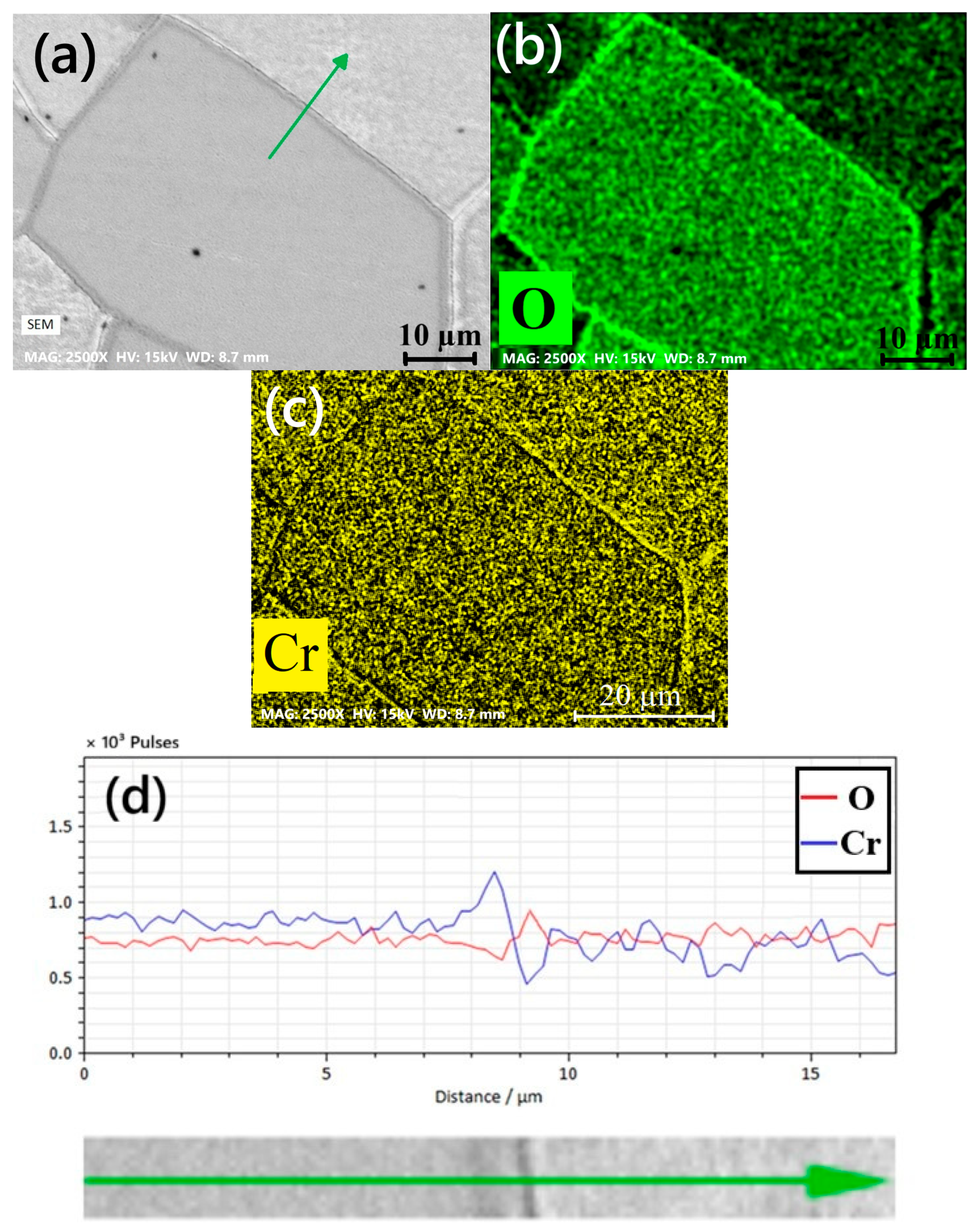 Hot-stage (800 °C) surface maps: (a) SEM (grain boundaries); (b) O; (c) Cr; (d) line profile across a grain boundary.