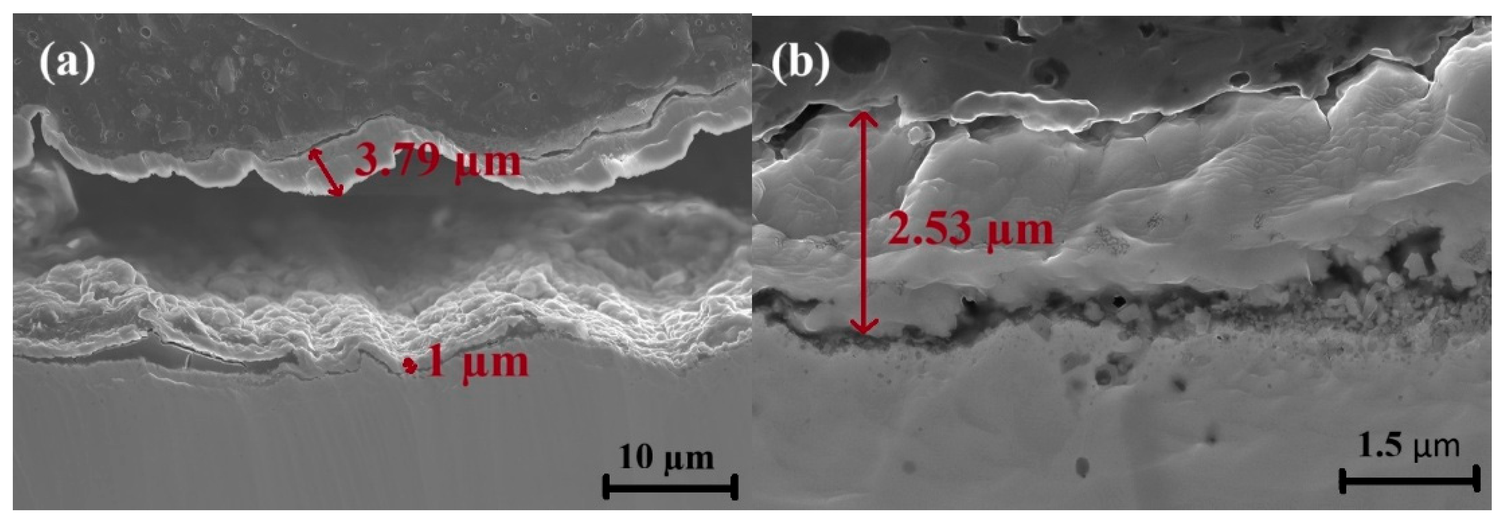 Figure 17 compares surface oxidation 1 mm from the fusion line under 5000 ppm O2 for the two buffing conditions. The 40-grit (B1) sample exhibits a significantly thicker oxide (~4.19 ± 0.40 µm), consistent with its rougher surface and higher density of high-energy sites that promote oxidation. Conversely, the 60-grit (B2) sample develops a thinner oxide (~ 2.43 ± 0.23 µm), reflecting a more uniform element distribution and fewer preferential oxidation sites. Lower misorientation and reduced grain boundary density in B2 restricted oxidation, producing a thinner, more homogeneous oxide []. Ji et al. [] similarly reported that higher roughness in 304 SS promotes thicker, porous oxides, whereas polished surfaces yield thinner, compact films.