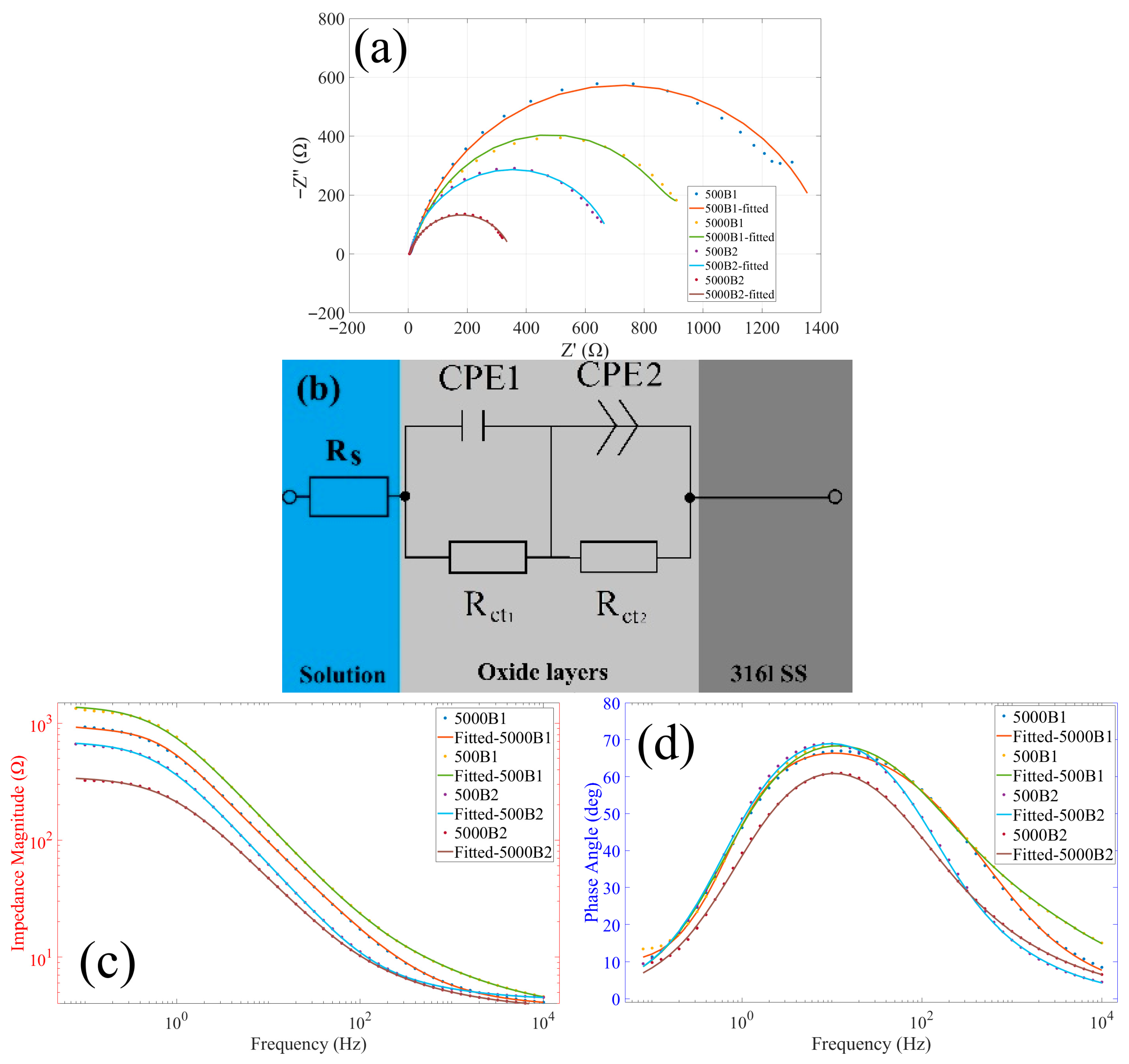 The correlation with EIS results further supports these interpretations. The higher overall impedance measured for B1 reflects its thicker, more resistive oxide layer formed on the rougher surface. However, the cyclic polarization data show that despite higher impedance, localized corrosion resistance is superior in B2, which repassivates more efficiently once pits form. Therefore, while rougher surfaces (B1) provide stronger initial resistance to pit initiation, smoother surfaces (B2) demonstrate better repassivation and long-term stability against localized corrosion.