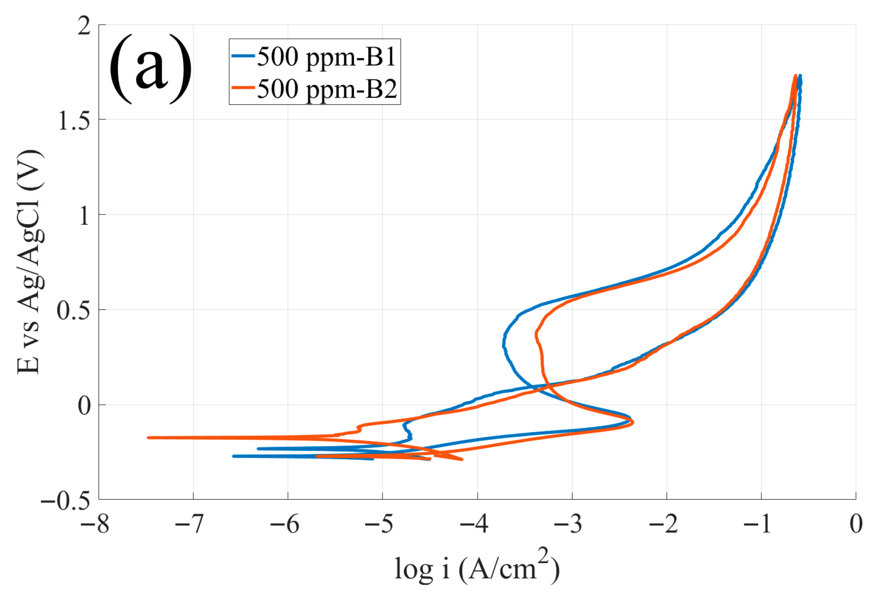 The superior pitting corrosion resistance of the 500 ppm samples compared to the 5000 ppm samples can be clearly observed from the polarization curves. The 500 ppm samples exhibit a lower pitting current density and a more positive pitting potential, indicating that higher energy is required for pit initiation and propagation. These features are indicative of a more stable passive layer, providing better protection against localized corrosion.