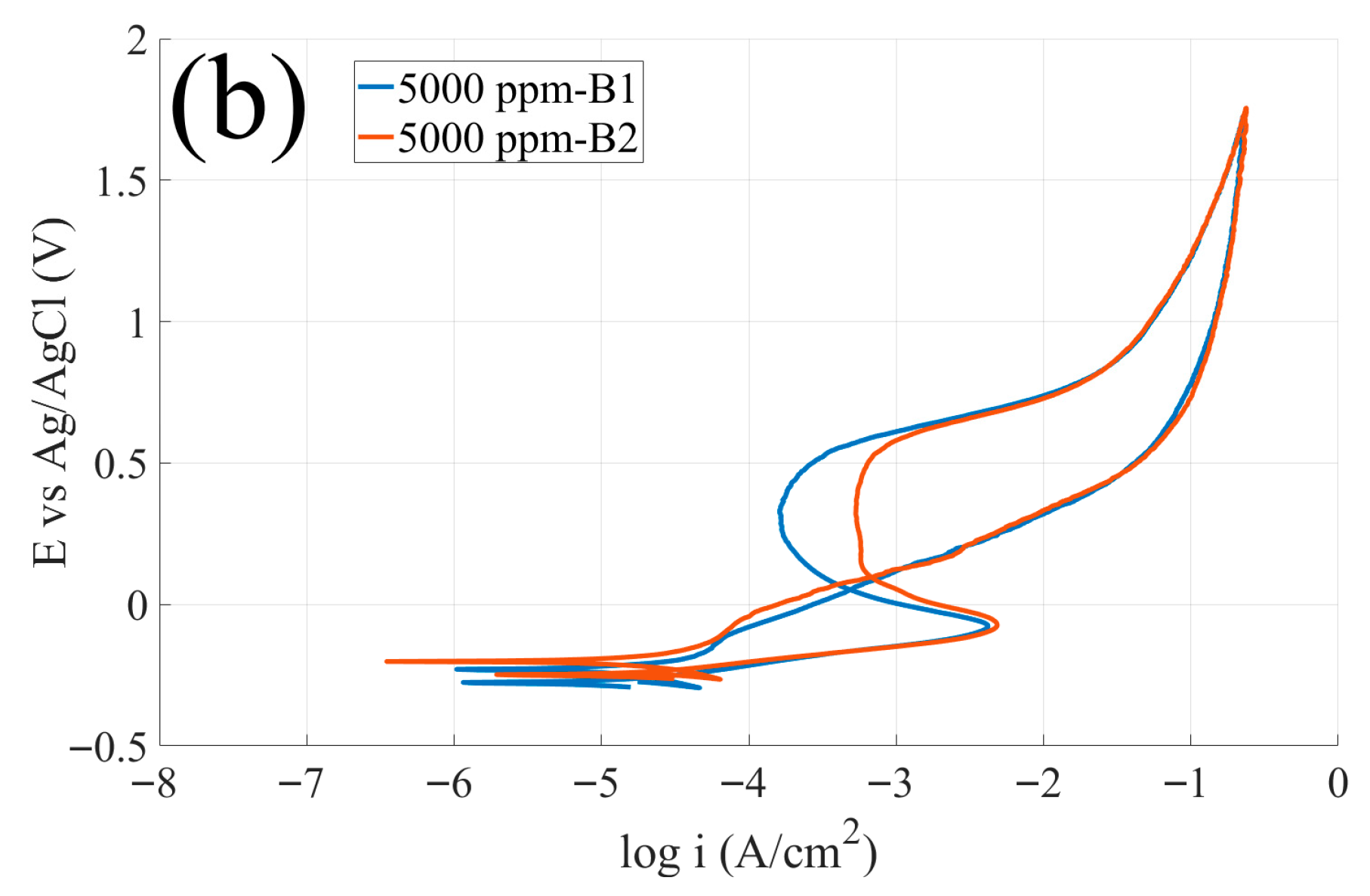 At 5000 ppm oxygen, the B1 samples exhibit ipitt 251 μA, which is lower than 409 ± 37 μA for B2, while B2 has 0.53 ± 0.02 V pitting potential, which is higher than 0.50 V for B1, indicating better resistance to pit initiation for B1. However, the repassivation behavior remains superior for B2. The repassivation current density for B2 is 748 ± 71 μA, higher than that for B1 (483 μA). The hysteresis loop area for B2 (1.12 A. V) is smaller than that of B1 (1.33 A. V), indicating better pit recovery and overall stability for B2.
