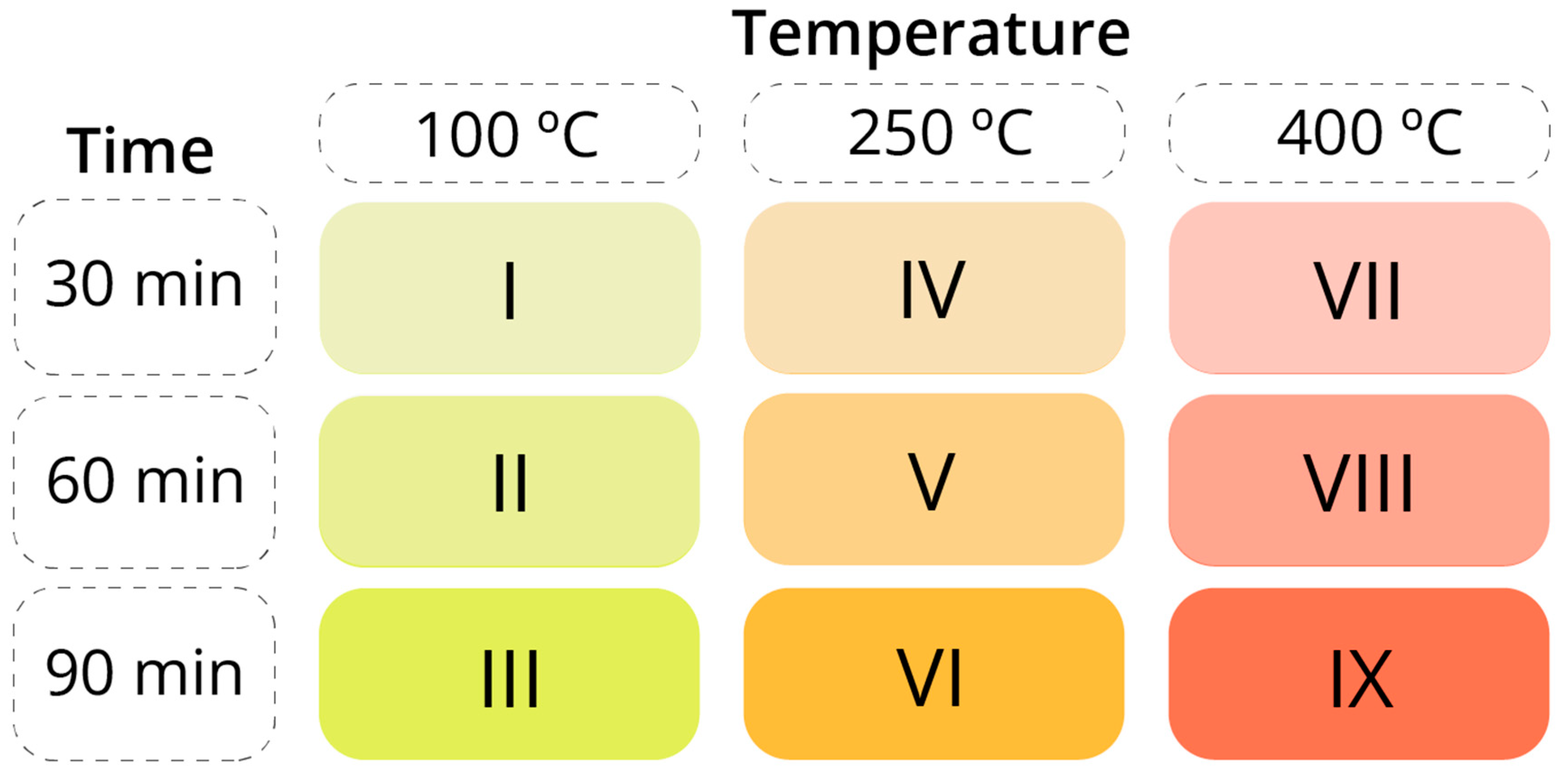 With the objective of assessing the influence of temperature on the degradation of Al/St joint properties through FSW, a sequence of thermal treatments was conducted on the manufactured joints, promoting the growth of an IMC layer at the joint’s interface. To monitor the kinetics of IMC layer growth, a total of 9 combinations of temperature and duration were chosen, spanning from 100 °C to 400 °C and from 30 min to 90 min. For each temperature/duration pair, three specimens were designated for tensile testing, while one additional sample was set aside for SEM/EDS analysis. The distribution of samples across each temperature/duration combination was carefully arranged to ensure uniformity and minimize potential biases inherent in the manufacturing process, which could otherwise introduce erroneous conclusions and correlations. The designation of each post-weld heat treatment pair is represented in Figure 2.