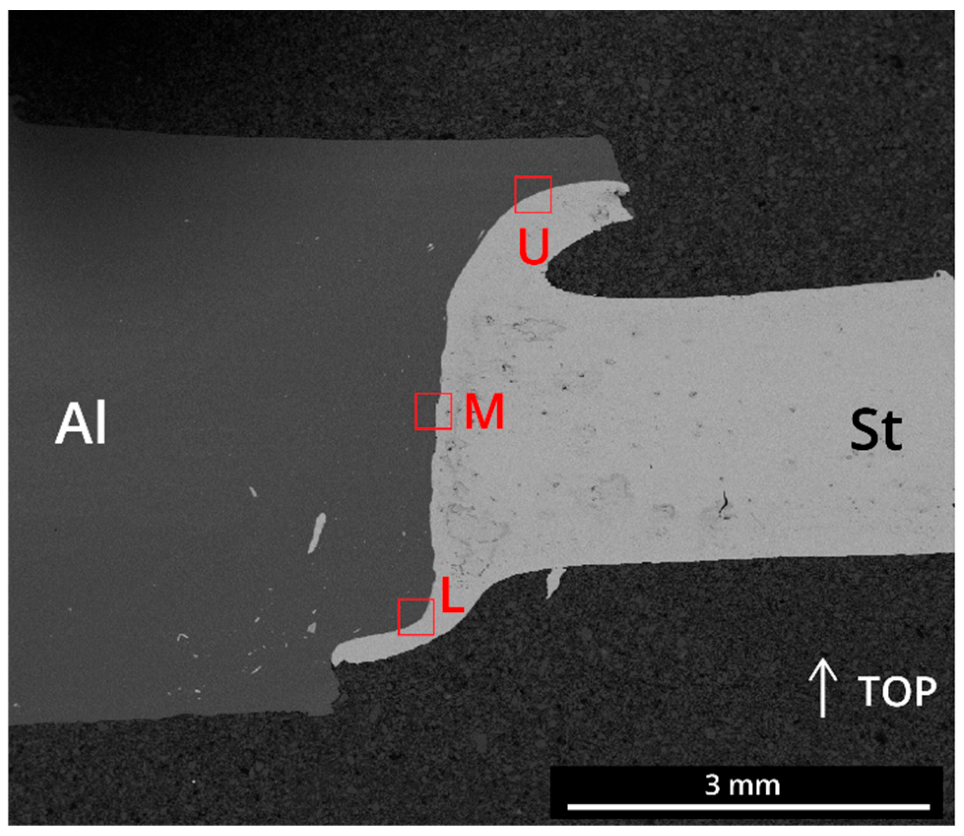 The middle zone M2 presents an IMC layer with no discontinuities but with regular thickness along the interface. In the aluminum substrate, some IMC particles are seen detached from the IMC layer, as seen in Figure 10e,f. At the lower zone L, the IMC layer appears more regular than the previous samples at the same zone; however, discontinuities exist in some sections of this zone, as seen in the top left side of Figure 10g,h.