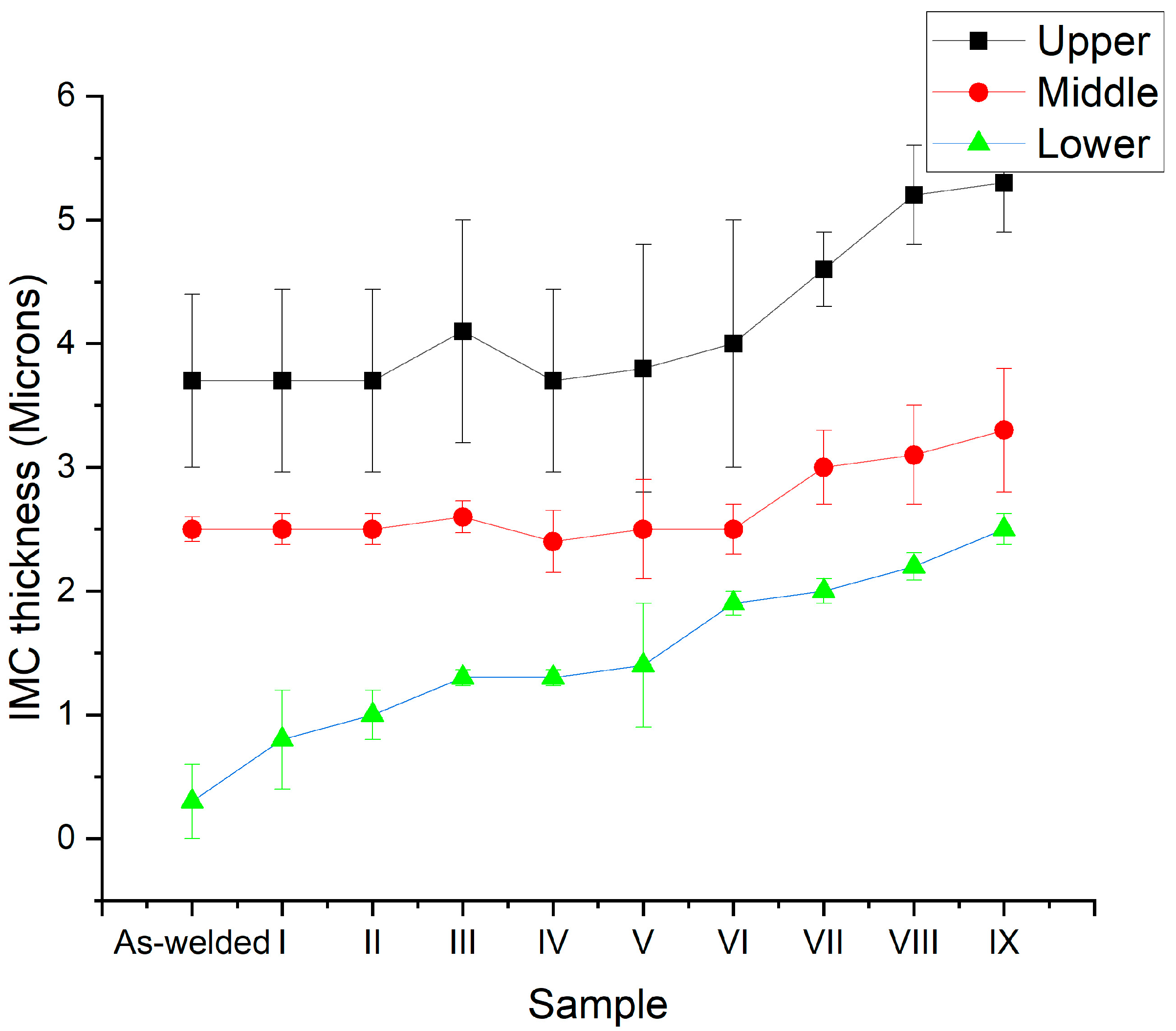 Since the peak temperatures reached during the welding process are higher at the top side of the joint, the IMC layer thickness is also higher in these zones, following the same correlation for the decreasing peak temperatures reached along the interface.