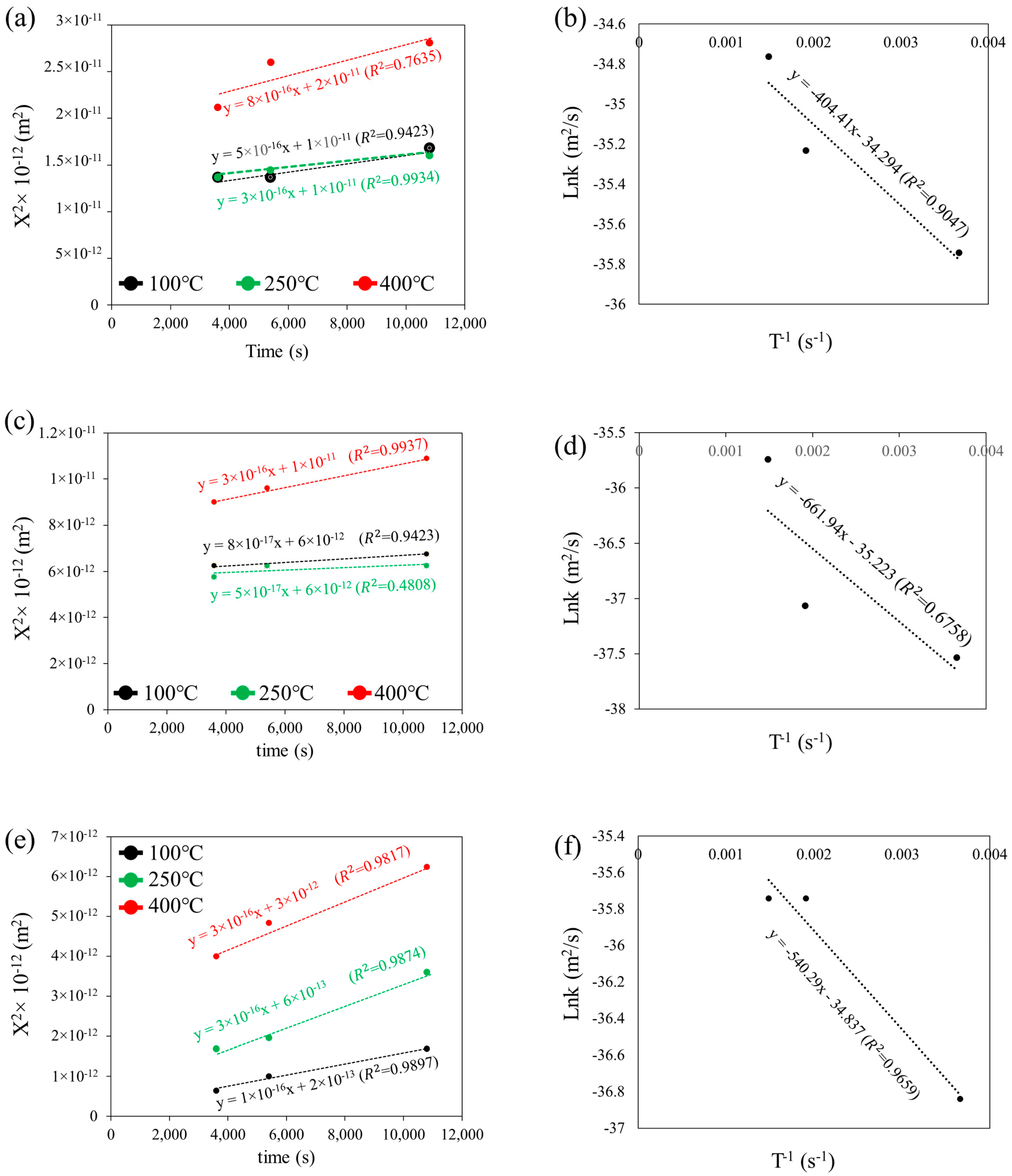 where k (m2/s) is the parabolic rate constant, and t (s) is time. As can be seen from Figure 13, the parabolic rate constant (k) in 100 °C, 250 °C, and 400 °C from the upper, middle, and lower zones has been calculated according to Equation (2).