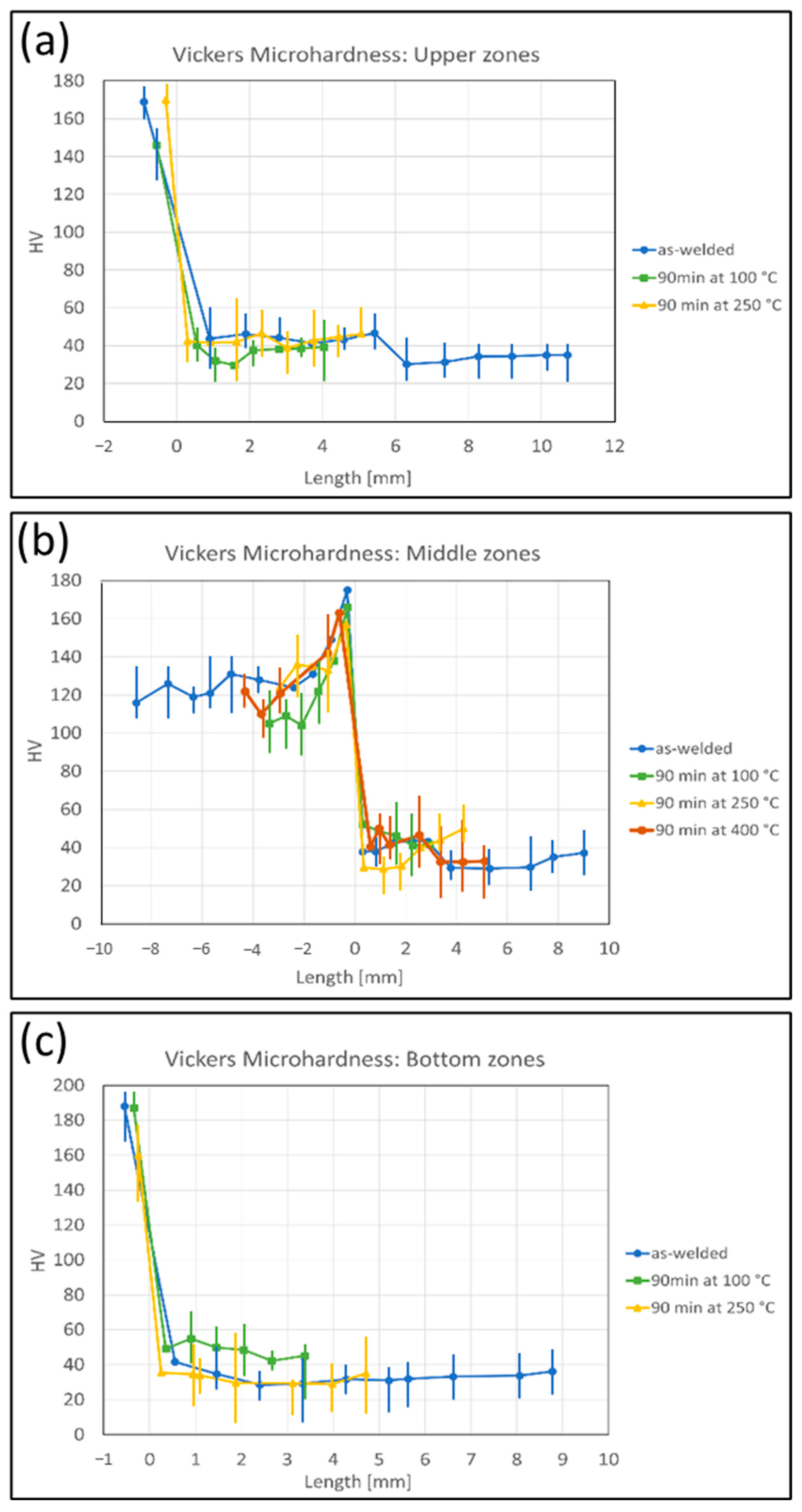 Figure 15. Vickers microhardness along the interface length of the three zones of as-welded, 100 °C, 250 °C, and 400 °C for (a) upper zone, (b) middle zone and (c) lower zone.