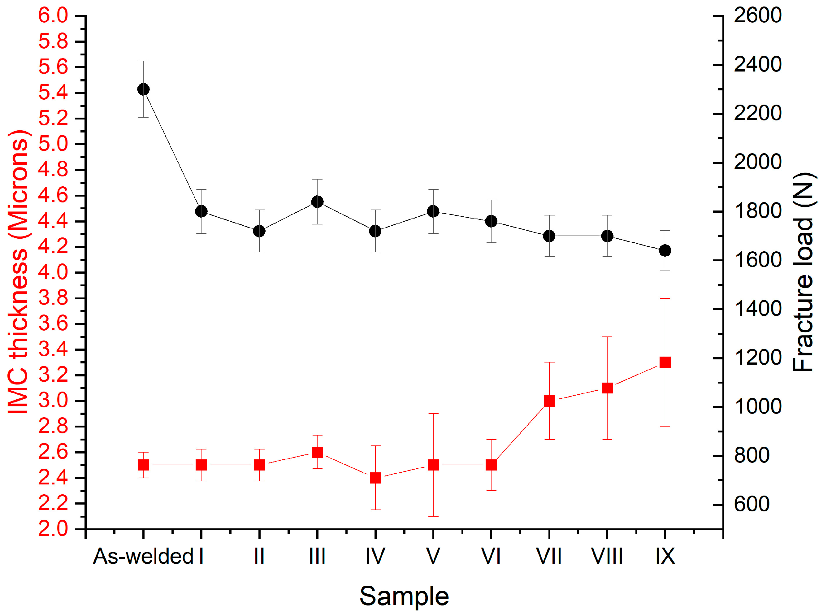 Figure 17. Plotted average main failure loads and IMC layer thickness at the middle zone, with respective trend lines.