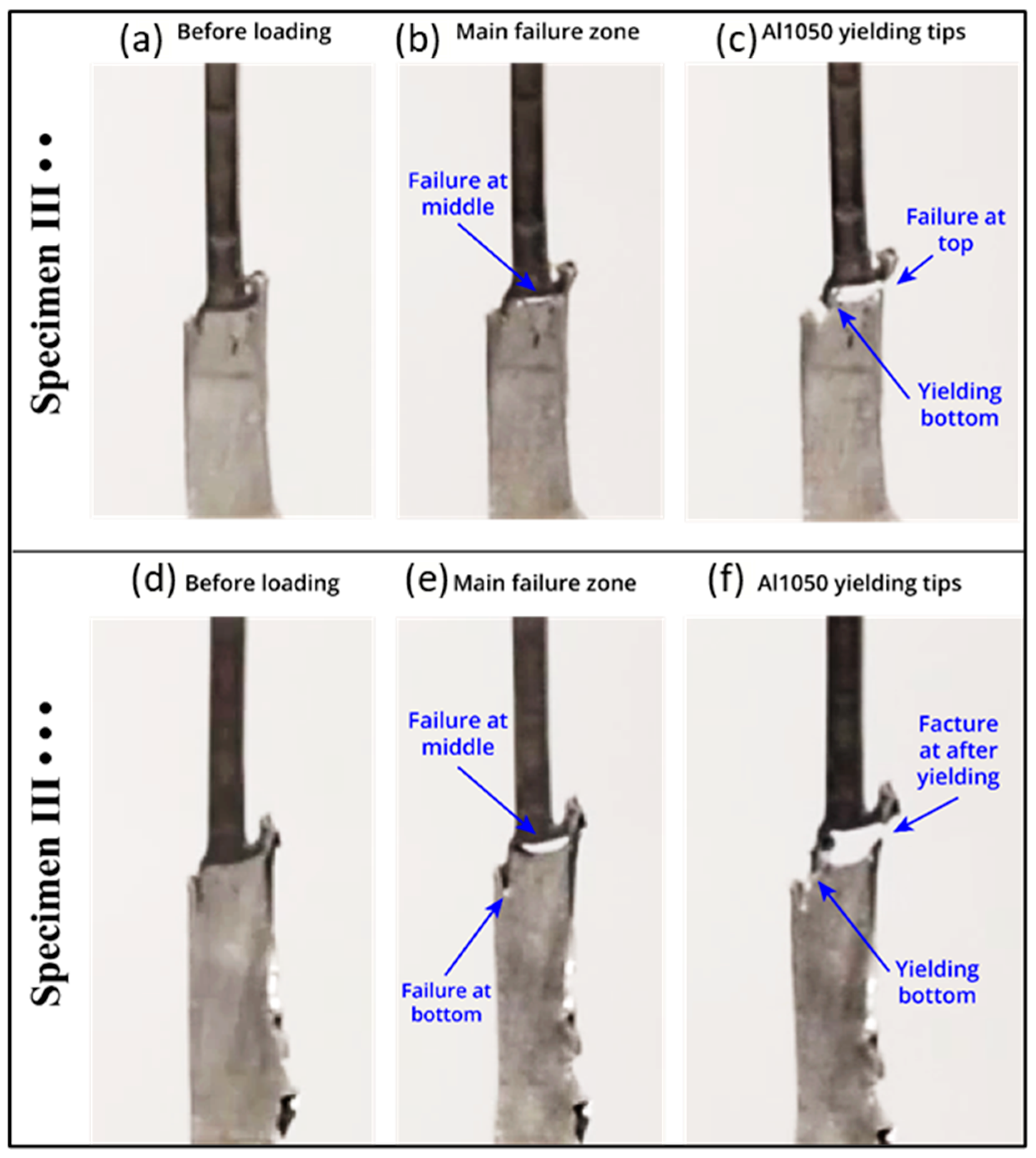 Figure 18. Specimens III • • and III • • • tensile test video frames before loading (a,d), at main failure zone and (b,e), at the yielding of the Al1050 tips of the joint interface (c,f), respectively.