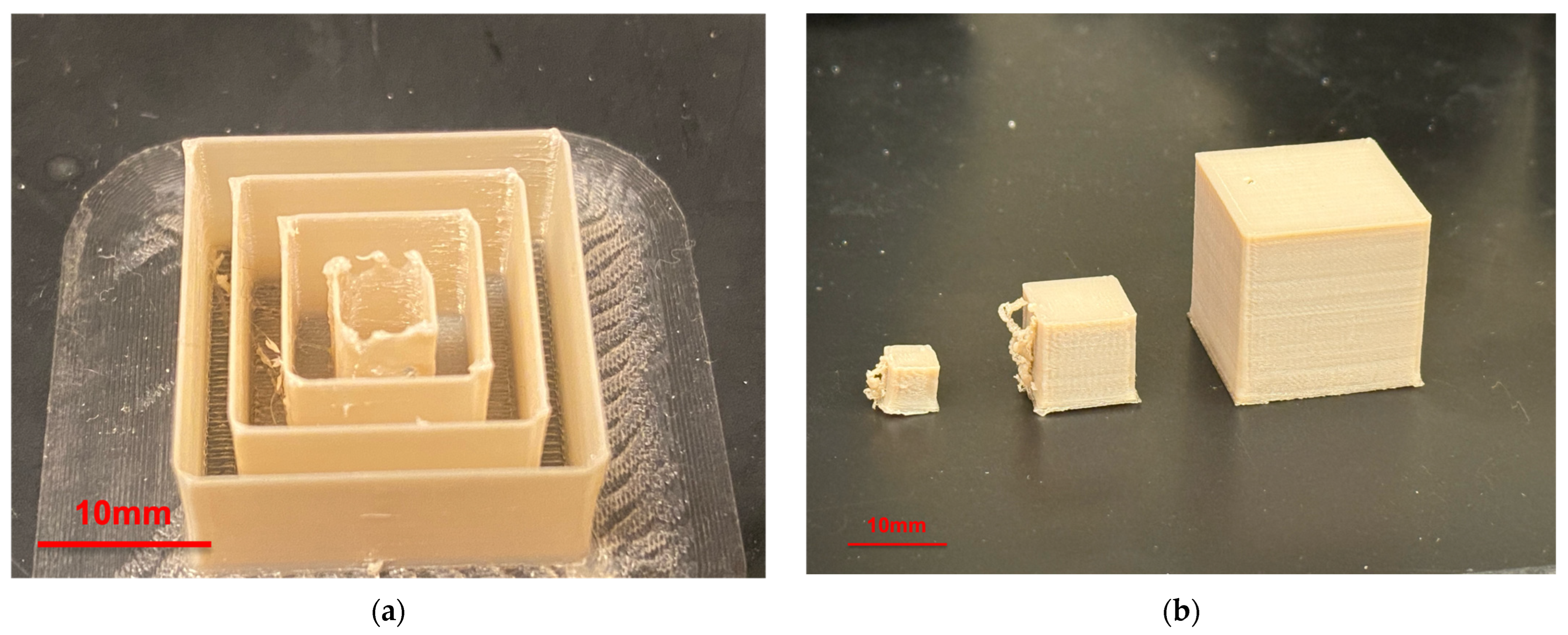 55]. Moreover, both studies focused on relatively large parts (>50 mm), which do not capture the challenges associated with small-scale features. In PEEK FDM printing, reducing the scale of printed geometry amplifies the effects of the material’s high viscosity and thermal expansion. These factors increase the likelihood of defects such as warping, over-extrusion, and dimensional deviation, making process optimization more challenging. This scale sensitivity is highlighted in