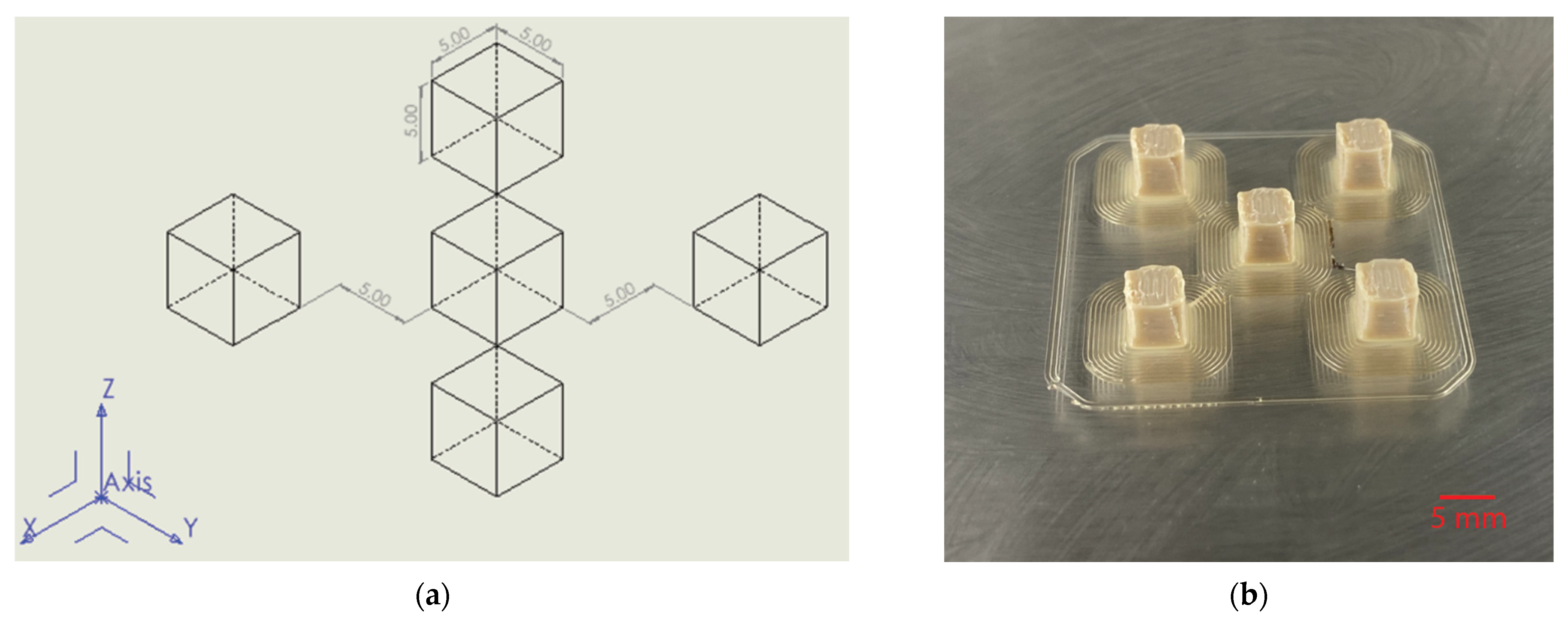 For each experimental run, five cube specimens measuring 5 × 5 × 5 mm were printed, evenly spaced on the build platform. The dimensions and spacing are depicted in