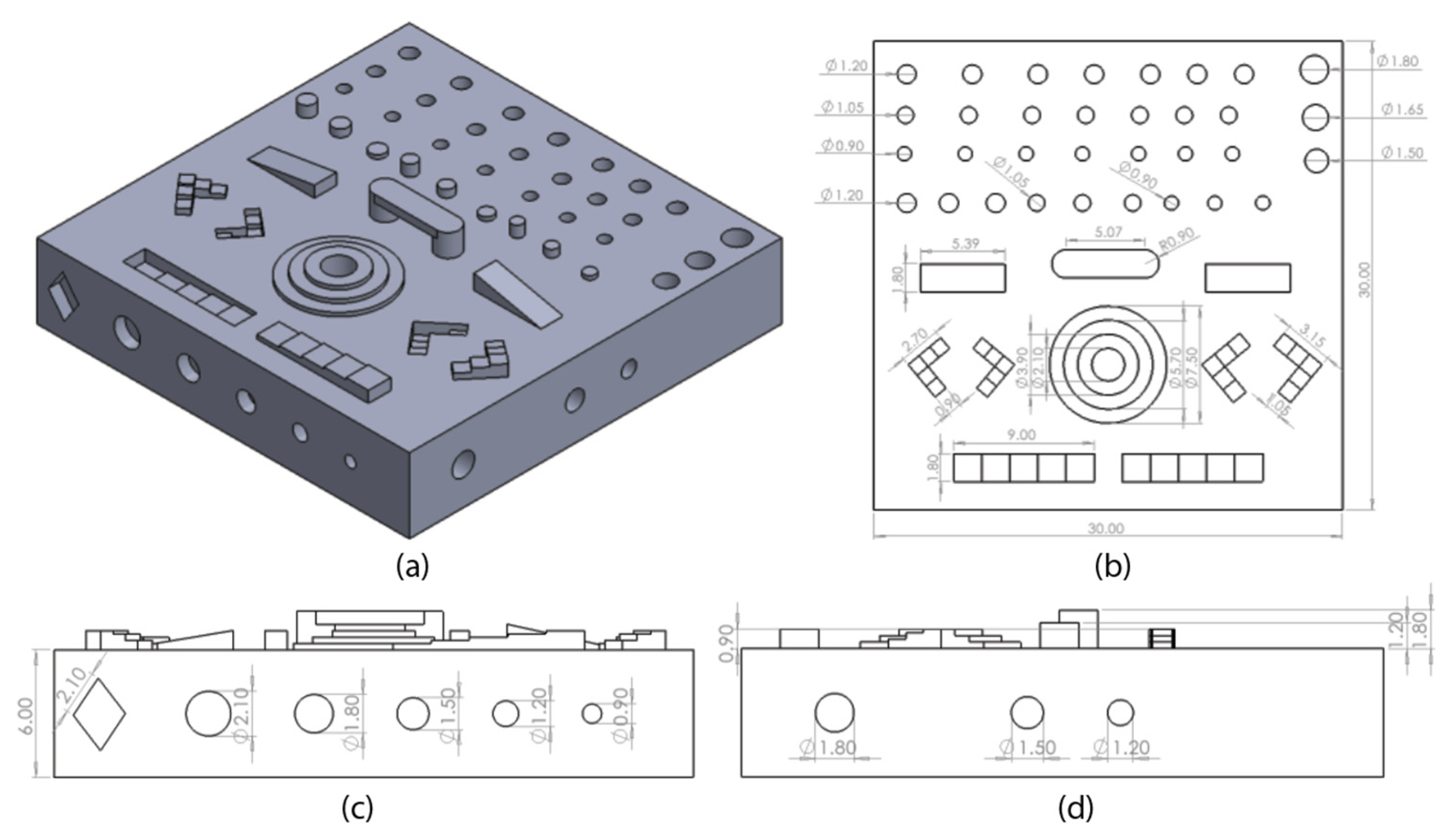 Figure 5a shows a 3D view of the benchmark model. These features included cylindrical pillars, through-holes (pores), stair-step structures, ramps, and a bridge, oriented along the horizontal, vertical, and diagonal axes.