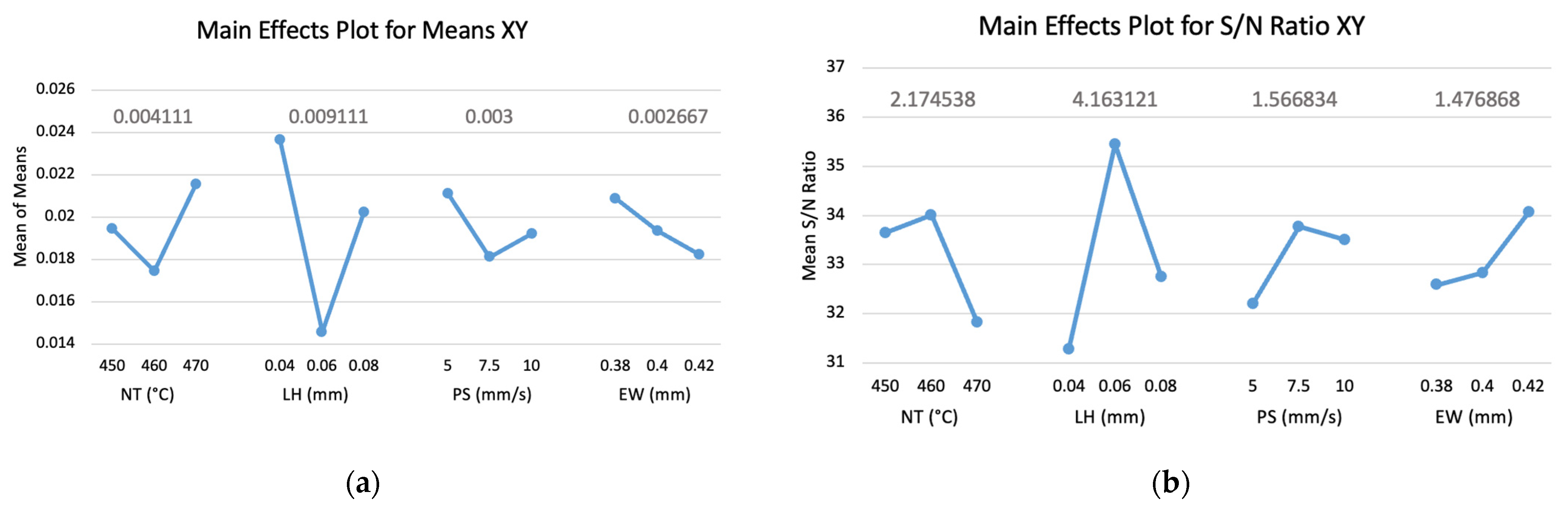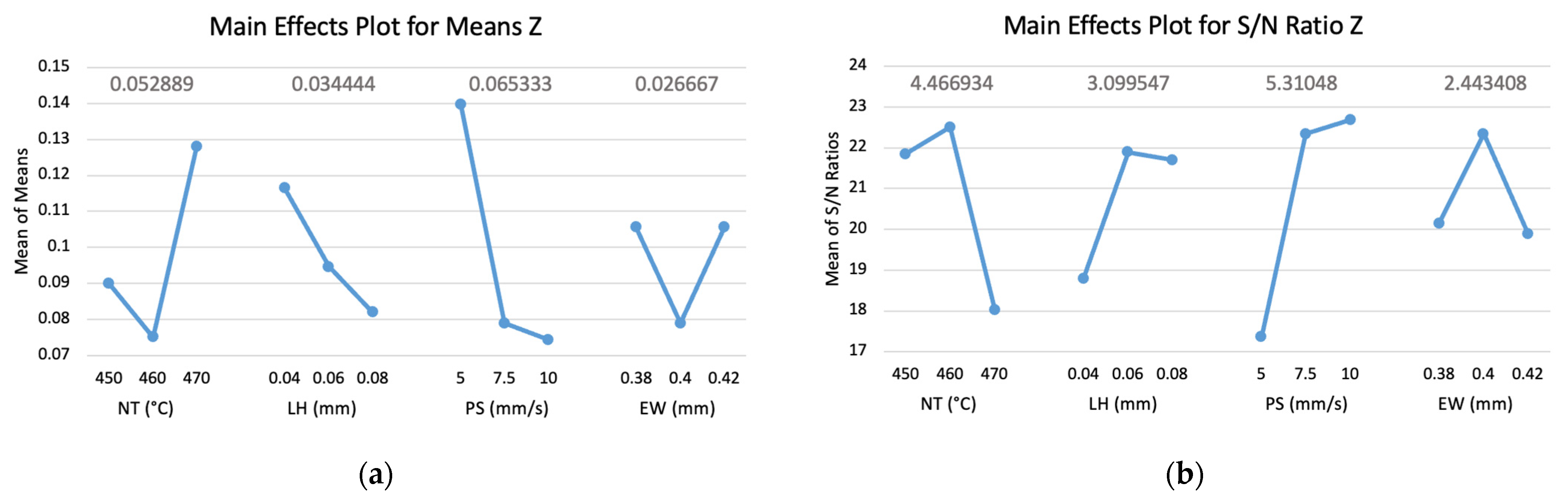 Figure 7b, where the highest S/N ratios were observed at a nozzle temperature of 460 °C (level 2) and a printing speed of 10 mm/s (level 3). A non-monotonic trend is observed for nozzle temperature and extrusion width, while mean deviation decreases consistently with increasing levels of layer height and printing speed. However, the trend for layer height becomes non-monotonic in