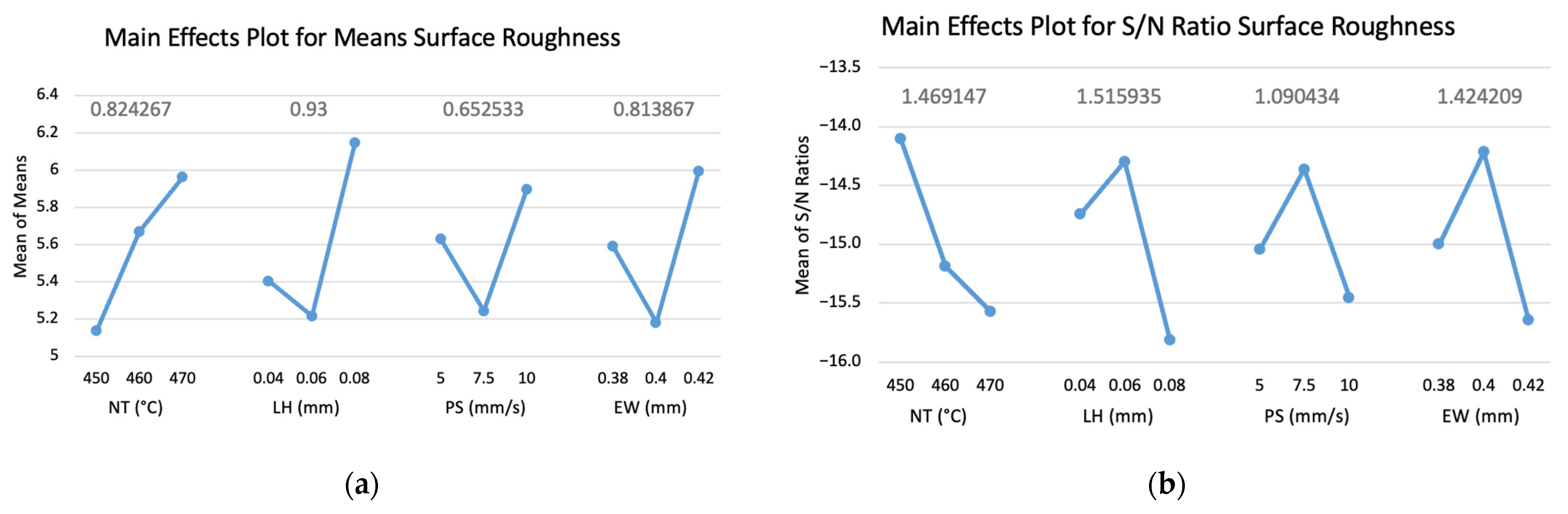 Figure 8a, all parameters exhibited their highest mean surface roughness values at Level 3, indicating that the worst surface finish occurred at the highest levels of each factor. Among the parameters, nozzle temperature was the only parameter to demonstrate a monotonic trend, with surface roughness increasing consistently across all levels. In