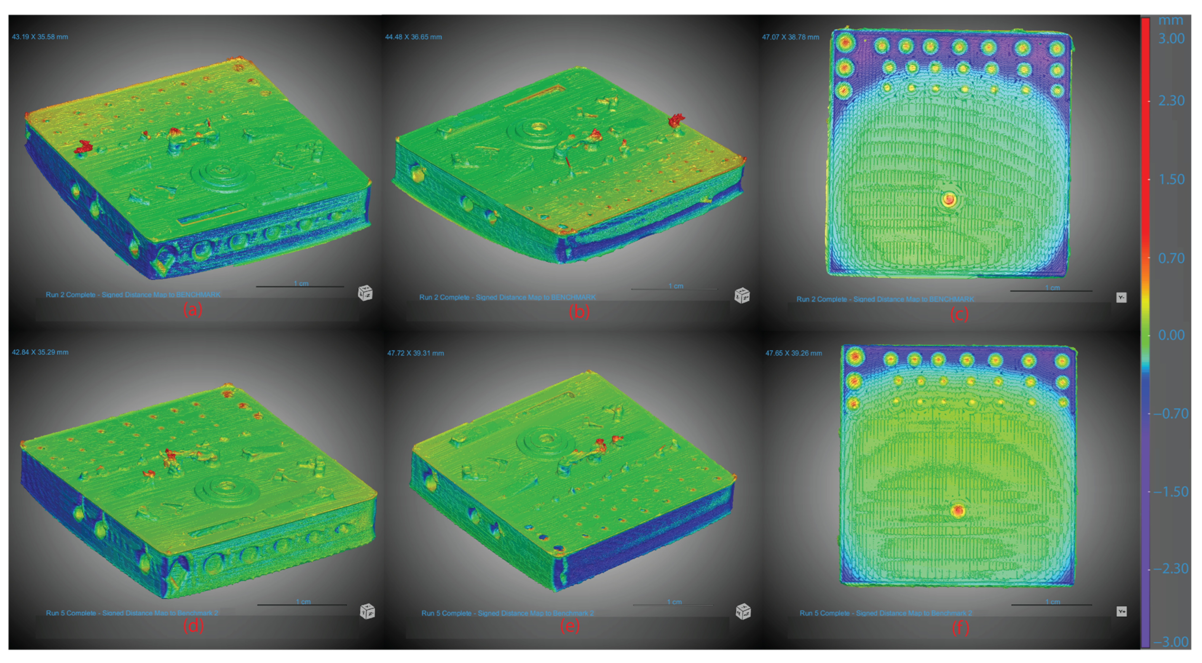 Table 9, both runs exhibited net undersizing, with mean deviations of −0.1415 mm (Run 2b) and −0.1623 mm (Run 5b), indicating slightly greater overall shrinkage in Run 5b. However, Run 2b showed substantially larger extrema (min = −2.6006 mm, max = 1.6447 mm), consistent with the severe warping and top-surface over-extrusion observed in