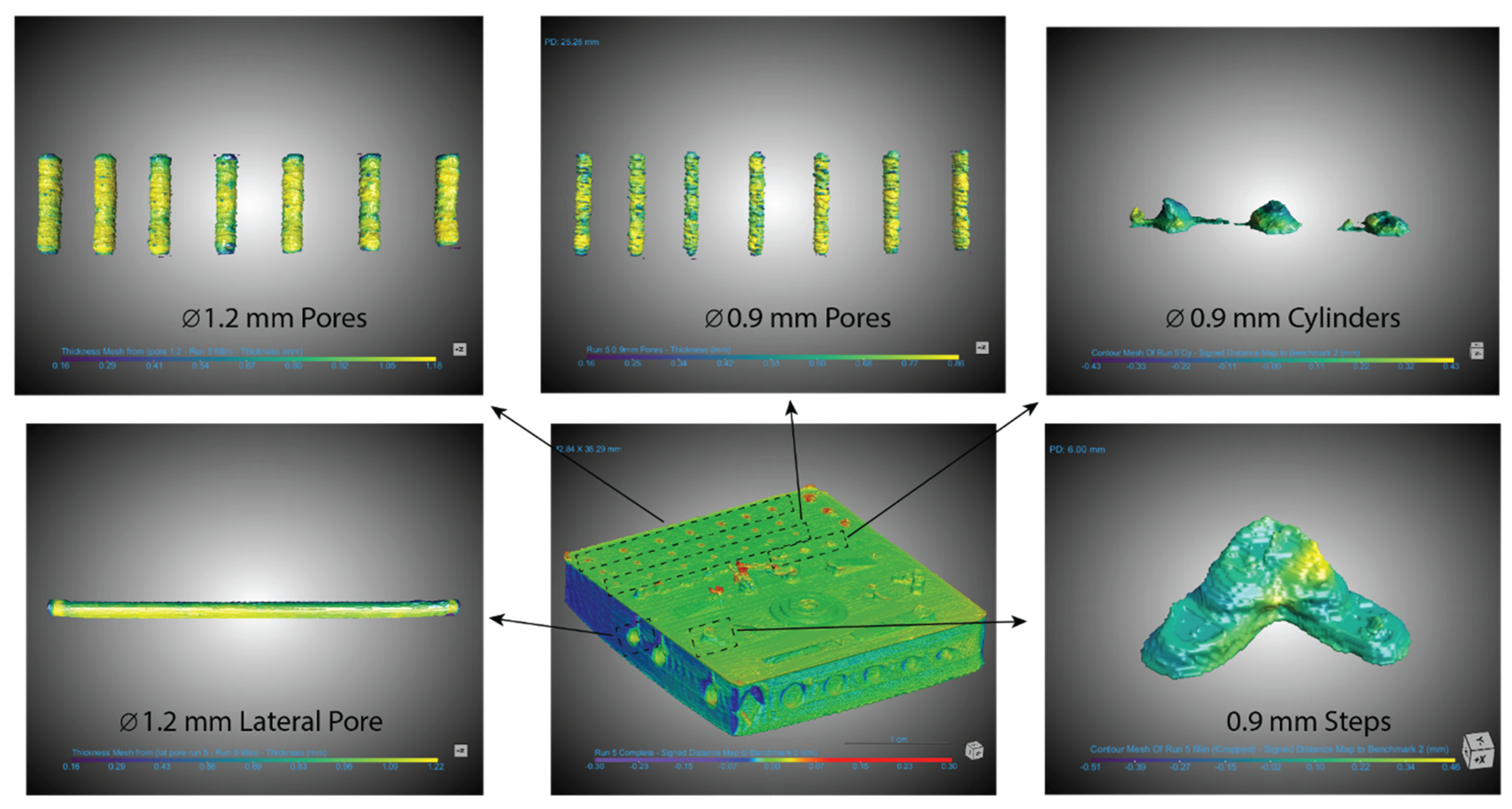 The benchmark models enabled validation of geometric fidelity across multiple feature types using micro-CT analysis. As shown in