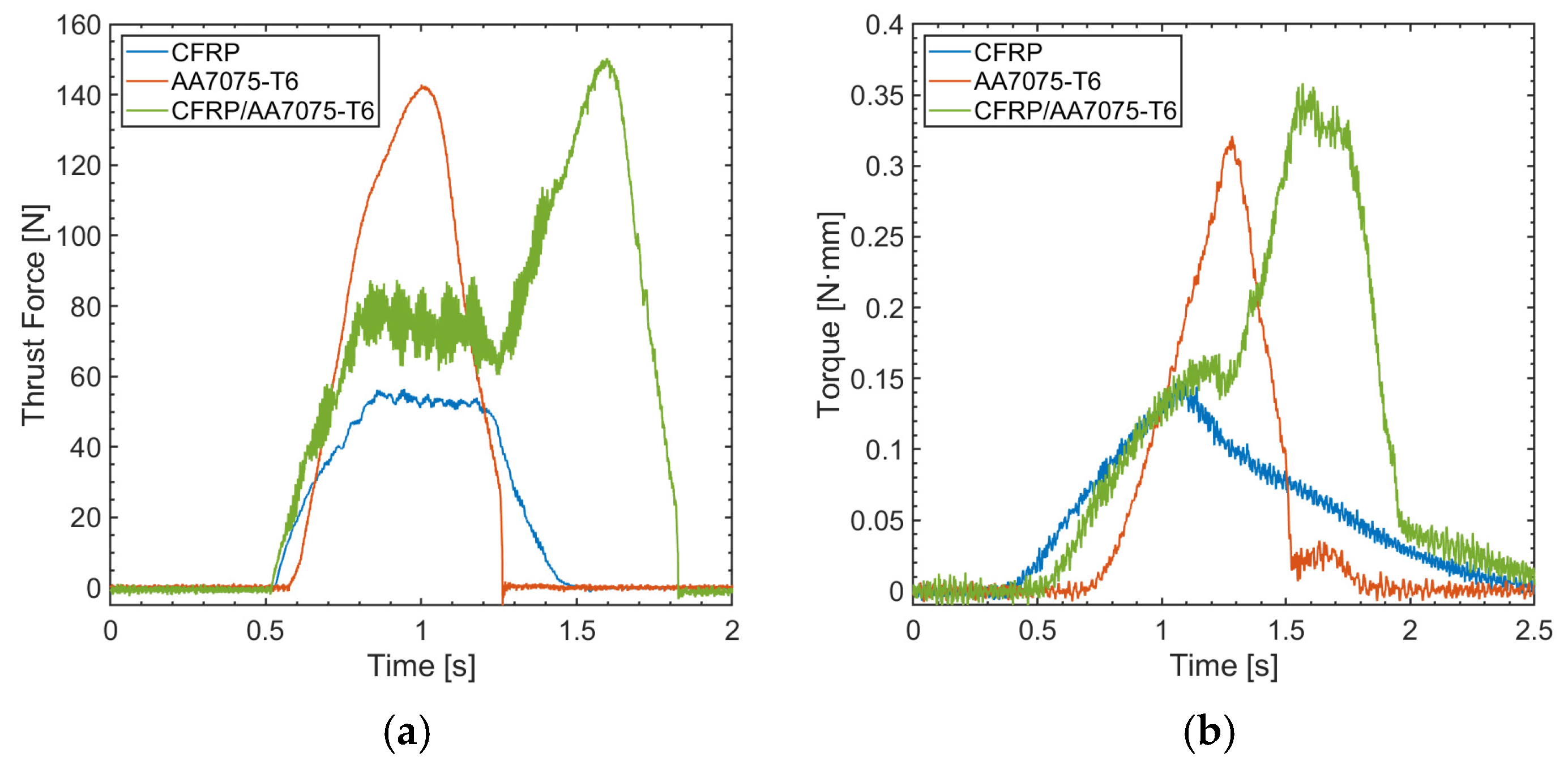 - Torque provides complementary information by quantifying the resistance encountered by the cutting edges during the drilling process. High torque values are often associated with increased friction, adhesion phenomena in ductile alloys (e.g., Al and Ti), or the excessive wear of the cutting lips [40]. In composite/metal stacks, torque fluctuations have been identified as a key feature for detecting the transition between layers and for developing adaptive control strategies [13]. However, torque is generally more difficult to interpret and less straightforward compared to thrust force.