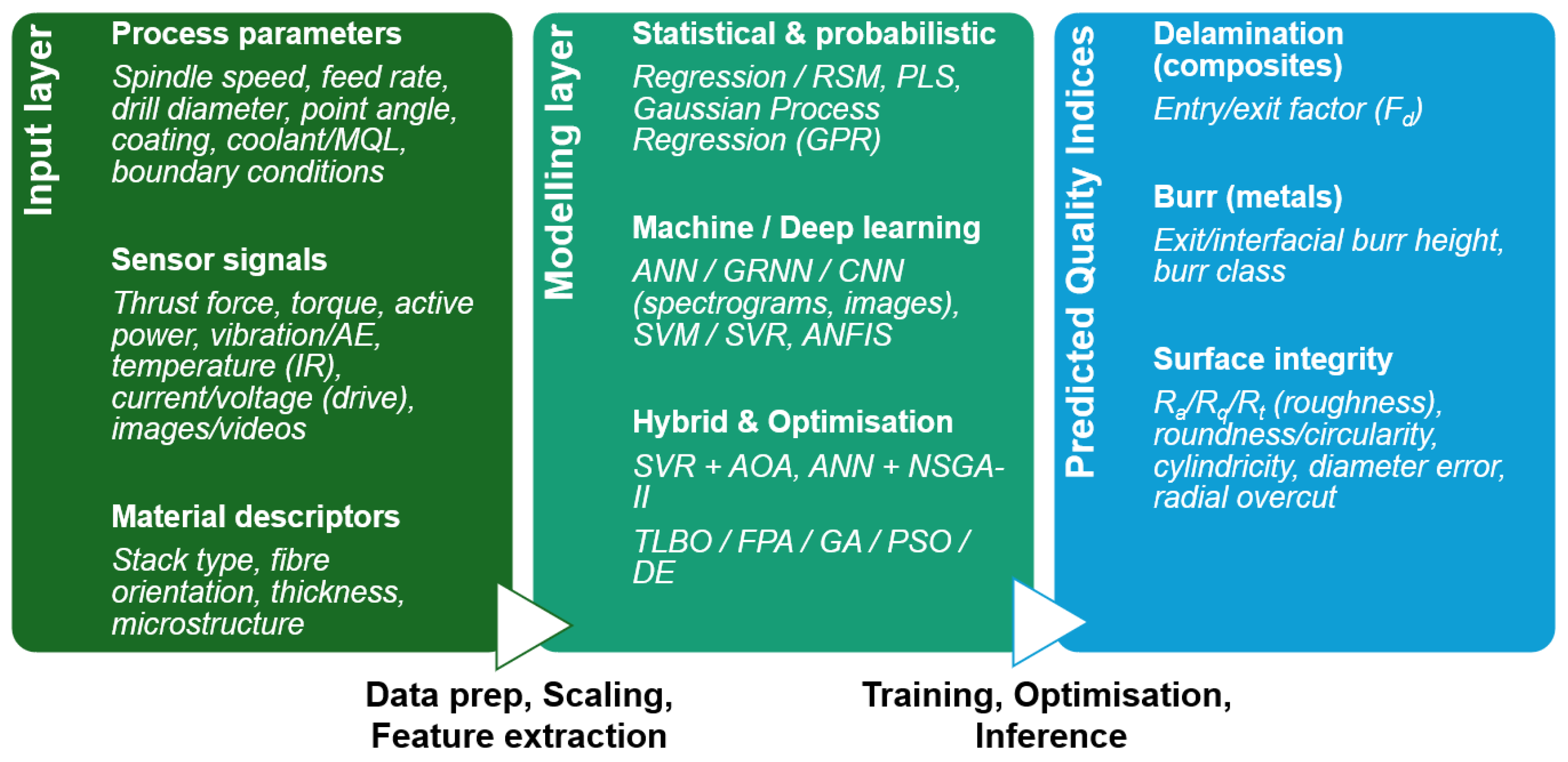 | Hybrid frameworks (e.g., ANN + NSGA-II; SVM + PSO; ANFIS + GA) | Multi-response optimisation combining parametric tuning with surrogate-based prediction (forces, roughness, delamination, MRR) | Combine predictive accuracy of surrogates with global search of evolutionary algorithms; yield Pareto-efficient solutions | Require large training datasets; computationally more sensitive; interpretability can be limited | [83,85] |