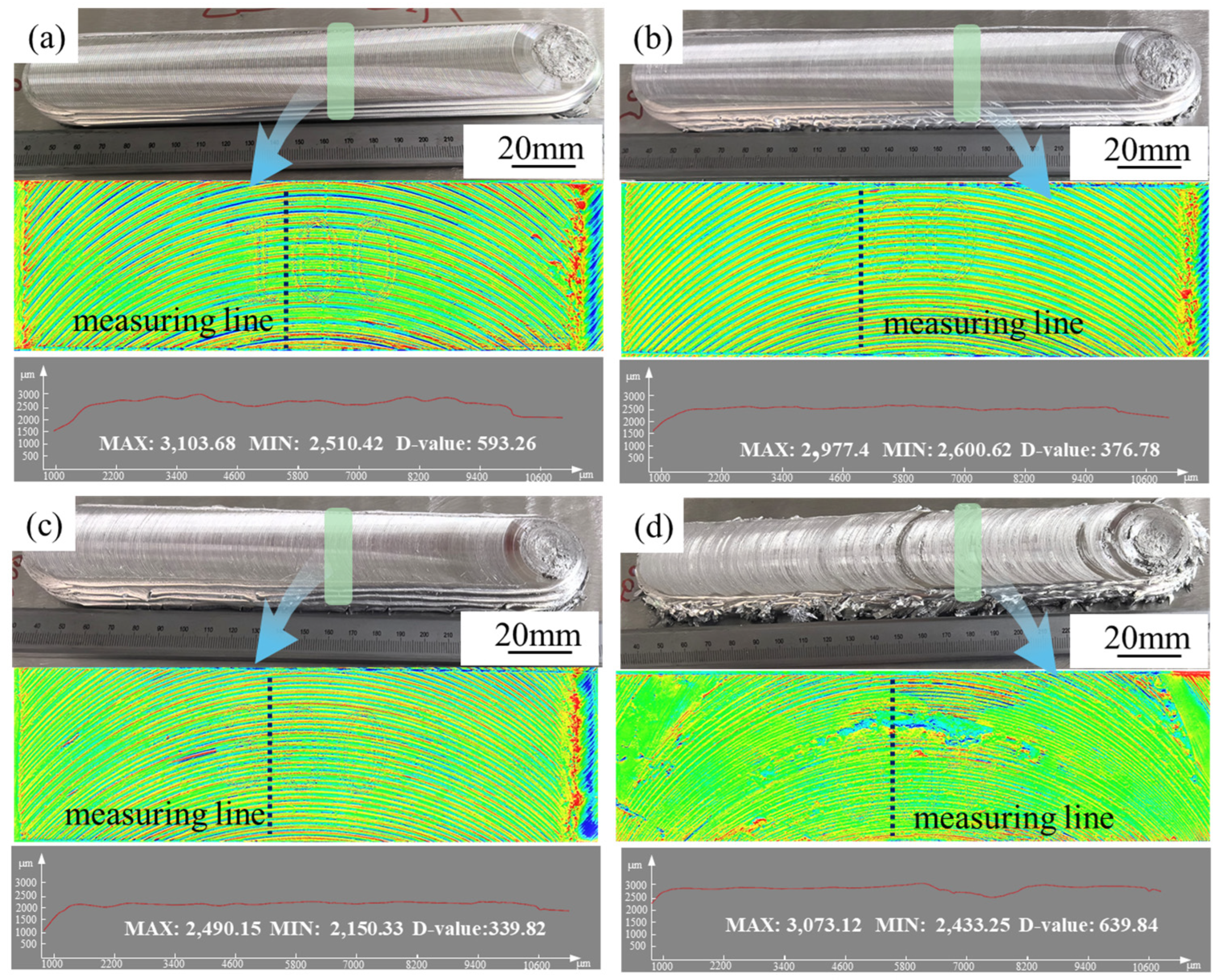 - Shafi, S.M.; Fatima, A.; Hendrickson, N.V. Characterizing Surface Waviness of Aluminum Alloy: An Approach to Minimize Post-Processing in Wire Arc Additive Manufacturing (WAAM) Production. J. Manuf. Mater. Process 2025, 9, 347. [Google Scholar] [CrossRef]