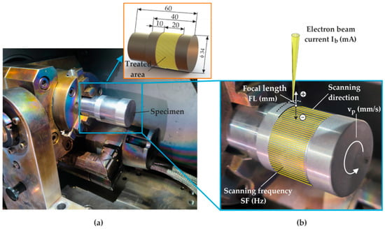 Figure 1a shows a general view of the equipment used. The operating parameters (governing factors) are visualized in Figure 1b. The treated area was symmetrically located on the specimen’s cylindrical surface to ensure uniform conductive heat transfer.
