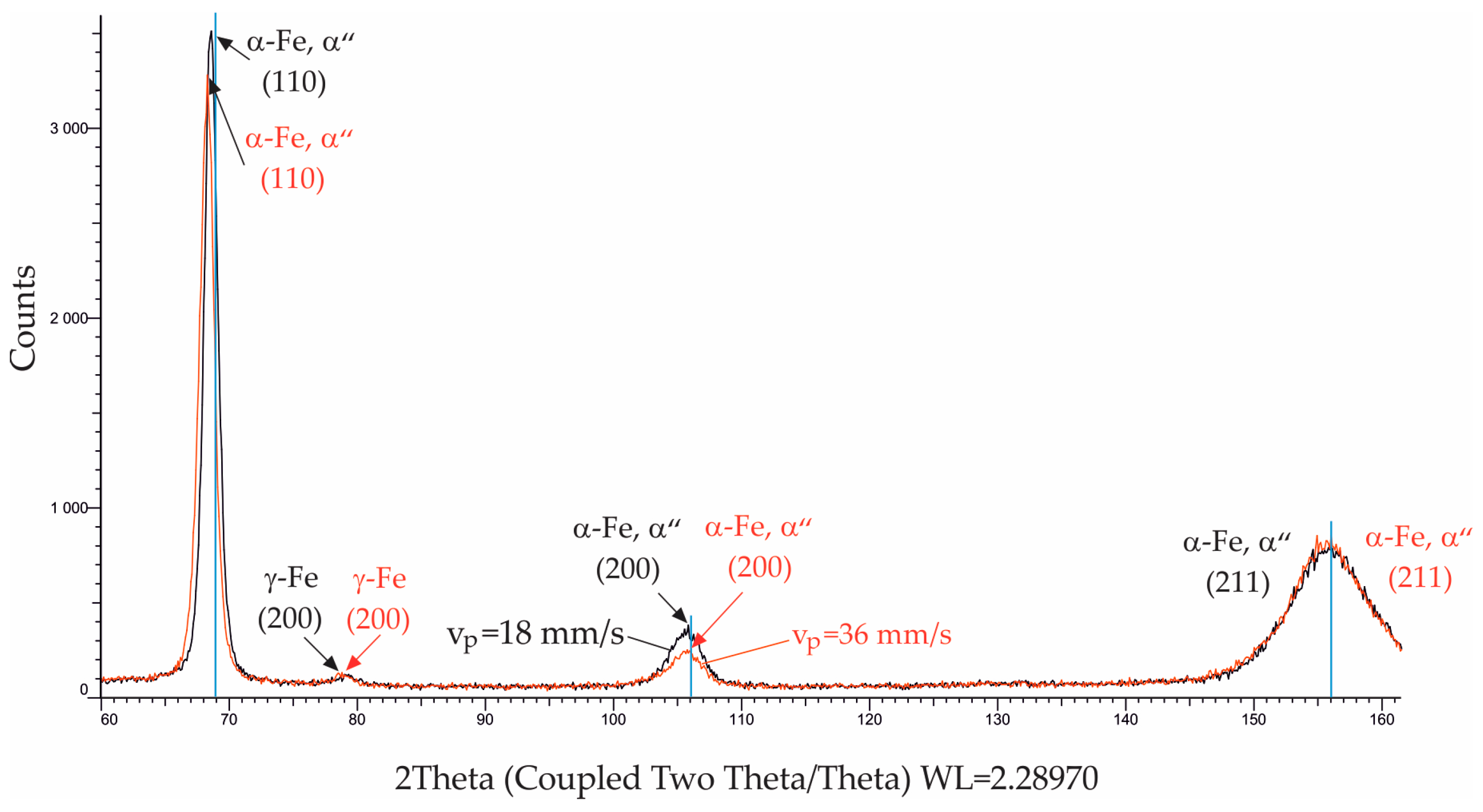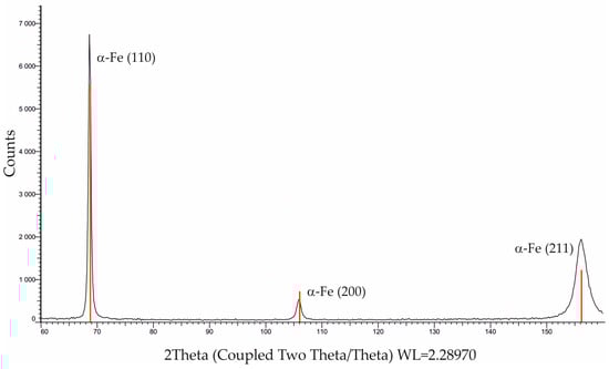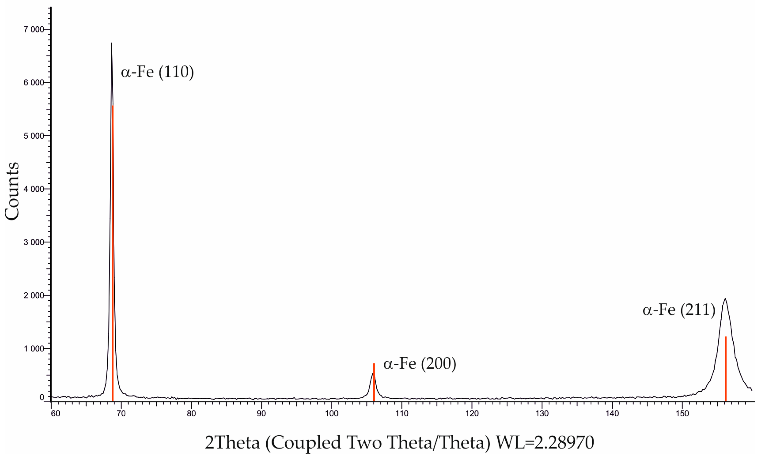 Figure 2 shows the phase analysis of the as-received steel. The diffractogram shows a distribution of α-Fe peaks characteristic of hypoeutectoid steels, which have a base structure comprising ferrite and pearlite.