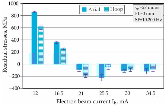 Figure 4 shows the effect of the electron beam current on the surface axial and hoop RS when the remaining three factors were fixed at constant intermediate values (see Table 1). The change in the magnitude of the electron beam current in the studied interval caused a change in both types of surface RS in a wide range: the axial RS varied from to , and the hoop RS varied from to .
