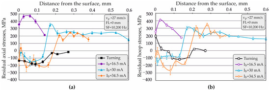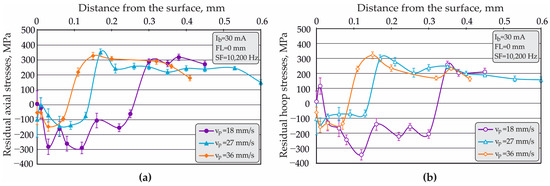 Increasing the and thus decreasing the duration of the EBH process significantly changed the RS profile and reduced the depth of the compressive zone for both types of RS. Regardless of the presence of small tensile surface stresses (Figure 6), the implementation of EBH with the smallest peripheral velocity ( = 18 mm/s) maximized the axial compressive RS (the maximum absolute value was ; Figure 7a), the hoop compressive RS (the maximum absolute value was ; Figure 7b), and the depth of the compressive zone for both types of RS to approximately 0.3 mm. Conversely, the workpiece peripheral velocities of and significantly reduced the maximum RS and the depth of the compressive zone to approximately 0.15 and 0.09 mm, respectively.