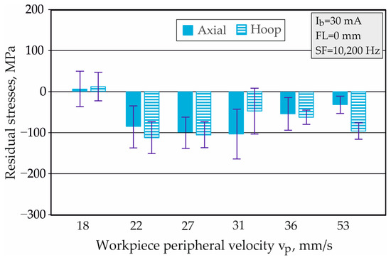 While other factors remained constant, the influence of the EBH process duration was estimated; for the studied interval of , this varied from 2.01–5.93 s. The implementation of the EBH process with the lowest velocity () led to the largest amount of heat input, reflected in insignificant tensile axial and hoop RSs. Increasing the workpiece peripheral velocity in the range of changed the RS to compressive. No clear trend was observed for the influence of on both types of RS. Considering the relatively large scattering of the measured RS, the variation in axial RS reached a maximum for resulting in a range of to . When the workpiece peripheral velocity changed in the range , the compressive hoop RSs exceeded the compressive axial ones, except for (Figure 6).