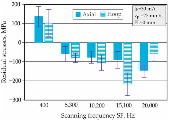 The variation in the SF in the studied interval significantly changed the surface axial and hoop RSs when the remaining three factors were maintained at constant values (Figure 8). The lowest value, caused uneven heating due to the large step between the scanning lines in the circumferential direction. As a result of the thermal interaction between successive scanning lines, significant surface axial and hoop tensile RSs with relatively large scattering and a very rough topography were generated (see Table 3). Conversely, the range of changed the trend towards compressive RS. This trend had a different character for axial and hoop RSs. Increasing the SF in the interval Hz led to greater surface hoop compressive RSs, which significantly exceeded the axial ones. Increasing the SF in the interval Hz led to greater surface axial compressive RSs (Figure 8).