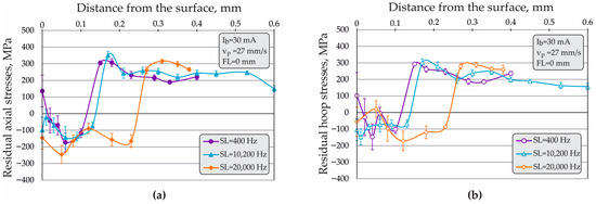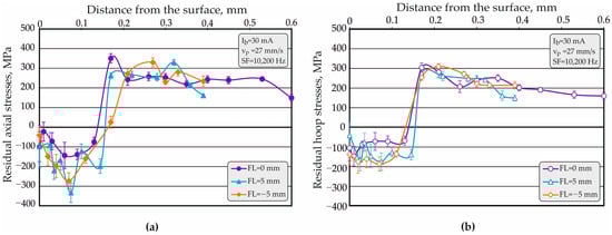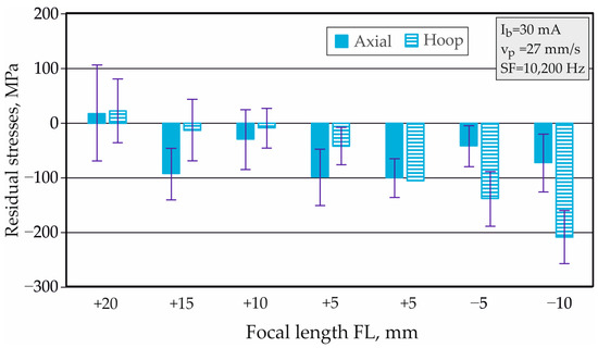 Figure 11a,b visualizes the influence of the FL on the distribution of axial and hoop RSs when the FL was varied in the symmetric interval from FL = to . Generally, a clustering of the obtained profiles of both types of RS was observed. Nevertheless, the implementation of EBH with and led to larger absolute values of the axial (Figure 11a) and hoop compressive RSs (Figure 11b). Additionally, the profiles of both types of RS formed smoother curves when the focal spot was below the surface (FL was negative), probably due to the less pronounced temperature gradient.