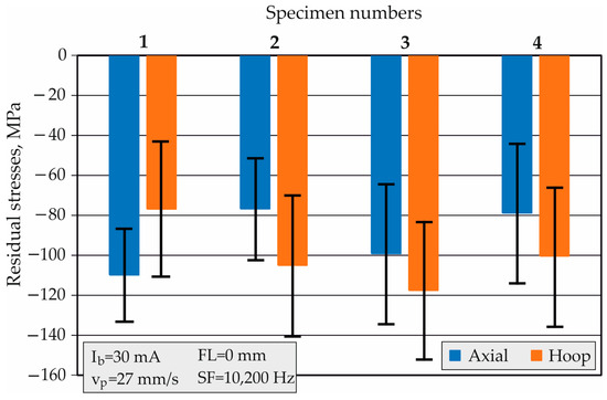 A repeatability experiment was conducted to evaluate the ability of the studied EBH process to reproduce RSs. For this purpose, four specimens were subjected to EBH with the same operating parameters. The experimental results for the surface axial and hoop RSs were obtained as the arithmetic means of five equally spaced circumferential measurements in the centre of the treated cylindrical surface (Figure 12). The deviation between the obtained averaged surface axial RSs was , and the deviation between the hoop RSs was (Figure 12). The main factors determining the obtained deviations were the structural and phase inhomogeneity of the processed surface and uniform heating due to the overlapping effect in the circumferential direction [47].