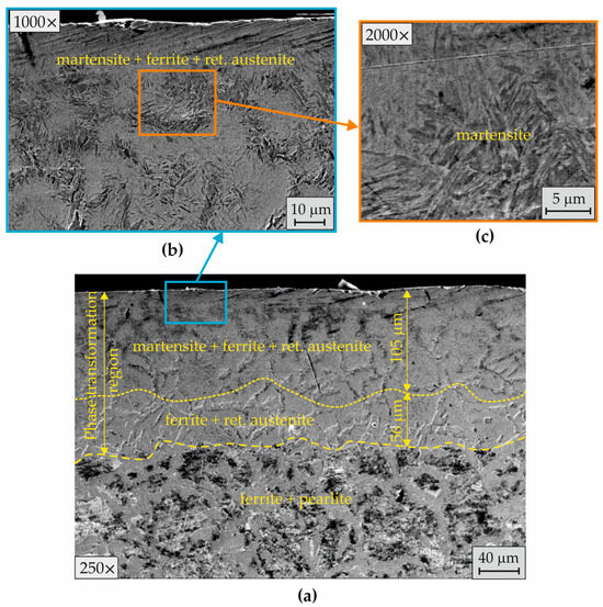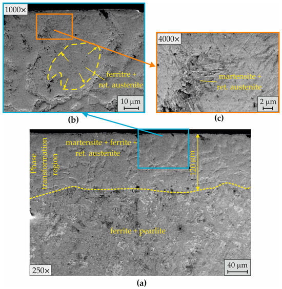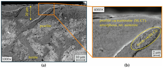 Figure 16 shows the SL microstructure after EBH with a lower workpiece peripheral velocity (). This led to a longer heating time and a deeper phase transformation region (Figure 16a). Two zones were observed in the phase transformation region. At a depth of approximately 80 μm, the structural and phase changes resulted from the phase pretransformation ferrite + perlite → austenite → martensite + ferrite + retained austenite (Figure 16a). At higher magnifications, a very thin surface molten layer was observed (Figure 16b). The structural and phase inhomogeneity in the upper surface zone was due to the short time of hypereutectoid temperature ϕ and insufficient time for the diffusion processes to fully occur. The kinetic phase-building was associated with the diffusion process equalizing the carbon concentrations between the individual hereditary austenite grains formed from ferrite and pearlite (Figure 16b). After diffusion of the carbon from the hereditary pearlite colony (pearlite → austenite) and cooling after the termination of direct contact with the electron beam, a second phase transformation (recrystallization) occurred in the hereditary ferrite grains (ferrite → austenite). As a result of the additional dissolved carbon, the austenite formed from the ferrite grains transformed into martensite. The carbon was significantly reduced in the zones along the boundaries between the hereditary austenite grains (formed from ferrite and pearlite), which were produced as a ferrite phase after recrystallization.