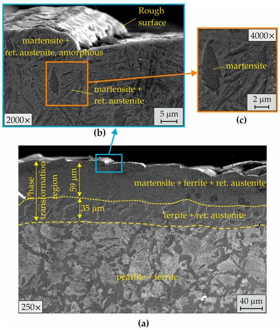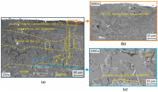 The EBH implementation with the largest investigated electron beam current () increased the transition layer depth to approximately 225 μm, where three zones with characteristic phases and structural changes were formed (Figure 14a). In the upper SL, the significantly higher PD favoured the transformation of the two-phase structure into needle-like martensite, amorphous grains, and retained austenite (Figure 14b). In the intermediate zone, the thermal conditions led to a partial phase transformation of ferrite into low-carbon martensite. At the boundary with the bulk material, the pearlite colonies transformed into martensite, amorphous grains, and retained austenite (Figure 14c). The resulting modification of the microstructure led to an approximately threefold increase in the surface microhardness and hardened transition zone with a depth of approximately [47].