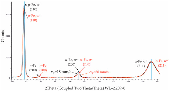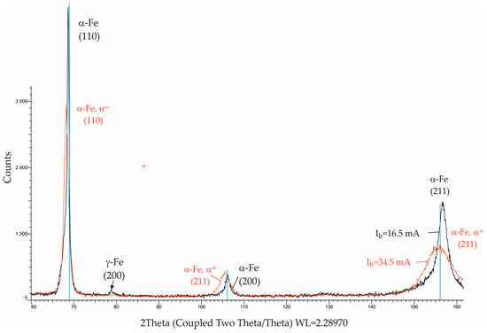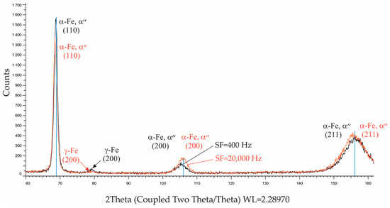 Figure 15 shows the phase analysis of the two specimens subjected to EBH with and . The diffractogram of the specimen subjected to EBH with shows the presence of retained austenite immediately below the surface due to the rapid solidification of the thin modified layer. Compared to the diffractogram in the as-received state (Figure 2), a broadening of the peaks in the diffractogram of the specimen subjected to EBH with was observed (Figure 15). This observation indicated the resulting pseudo-amorphous structure and microstrain in the upper SLs.