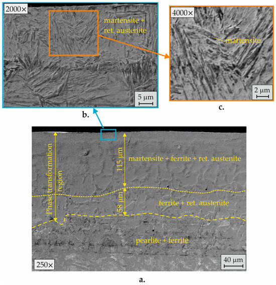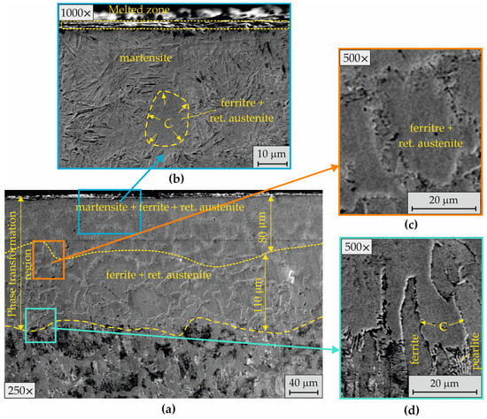 Due to the difficult diffusion, the increased amount of carbon, and the relatively high cooling rate, retained austenite was formed in the core of the pearlite colonies. The transfer of carbon between the two types of inherited austenite grains was difficult in the lower zone formed with a thickness of approximately 110 μm (Figure 16a) due to the lower temperature and insufficient time for the diffusion processes to occur. In this zone, no phase recrystallization of ferrite had occurred, and after cooling, the phase composition was ferrite and retained austenite (Figure 16c). Figure 16d visualizes the transition between the heat-affected SL and the base material.