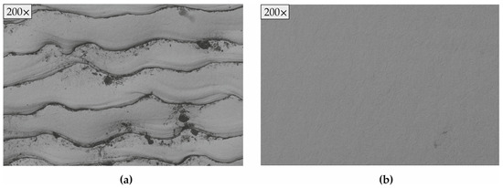 For all combinations of operating parameters, EBH caused a reduction in the initial roughness . Since the studied process is entirely thermal (there is no mechanical impact on the surface layer), the only reason for this phenomenon is the presence of a surface remelting effect. The only exception was observed for EBH with the lowest scanning frequency (SF) of 400 Hz ( and values are marked with “*” in Table 3). The SF parameter defines the number of linear scans of the electron beam in the axial direction in one second (Figure 1b). In fact, all processes using concentrated energy sources are characterized by a certain overlapping effect of the thermally affected zones generated by successive scans. Unlike the known methods of scanning rotational surfaces in a helical line (which exhibit an overlapping effect in the axial direction), the scanning mode in the novel EBH process results in the overlapping effect in a circumferential direction. Therefore, the reason for the deterioration of the roughness when the EBH was implemented with SF = 400 Hz was the uneven heating due to the large step between the scanning lines in the circumferential direction, which is reflected in a pronounced overlapping effect [47], resulting in a very rough topography (). The roughness evolution information in Table 3 shows a trend of a decreasing as the electron beam current and SF are increased. No clear trends were observed when changing the other two operating parameters.