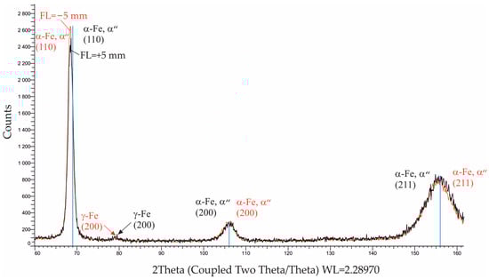 At fixed average values of the other EBH operating parameters, variation in the FL led to a significant change in the surface axial and hoop RSs due to the change in the area of the beam irradiating the surface (Figure 10). When the EBH was implemented with positive values of FL the focal spot was above the surface, and when the EBH was implemented with negative values of the FL the focal spot was below the surface (Figure 1b). Thus, the use of positive values of the FL leads to a lower surface temperature, limiting the martensitic transformation. In addition, the scattering of the measured surface RSs is the largest due to the surface remelting effect, causing deformation of the crystal lattices (texturing effect). Considering the inherent large scattering of the measured surface RS, the use of positive FLs in the interval showed a tendency towards tensile surface RS. Conversely, changing the FL from to stabilized the compressive RS, with this effect being more pronounced in the surface hoop RS.