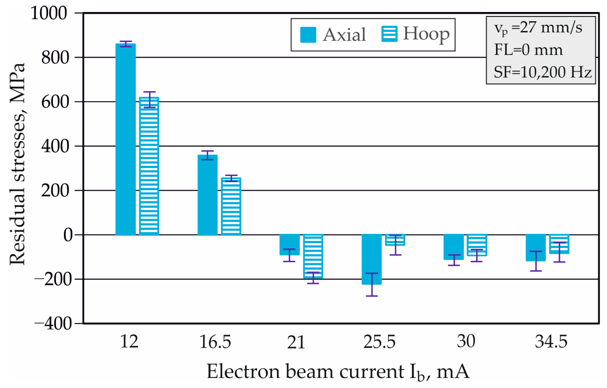 Figure 4 shows the effect of the electron beam current I b on the surface axial and hoop RS when the remaining three factors were fixed at constant intermediate values (see Table 1). The change in the magnitude of the electron beam current in the studied interval caused a change in both types of surface RS in a wide range: the axial RS varied from + 858.6 to 221   M P a , and the hoop RS varied from + 617.7   to 193.5   M P a .