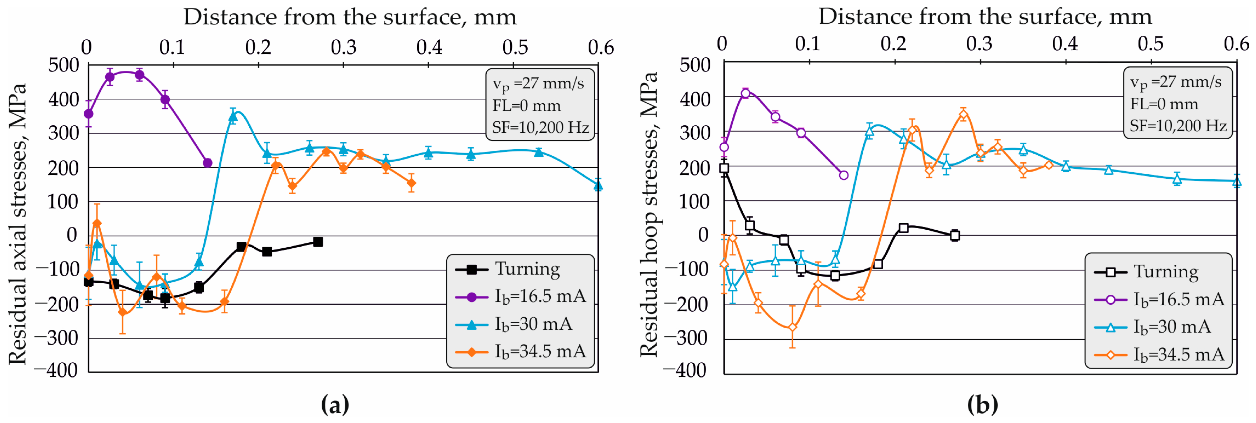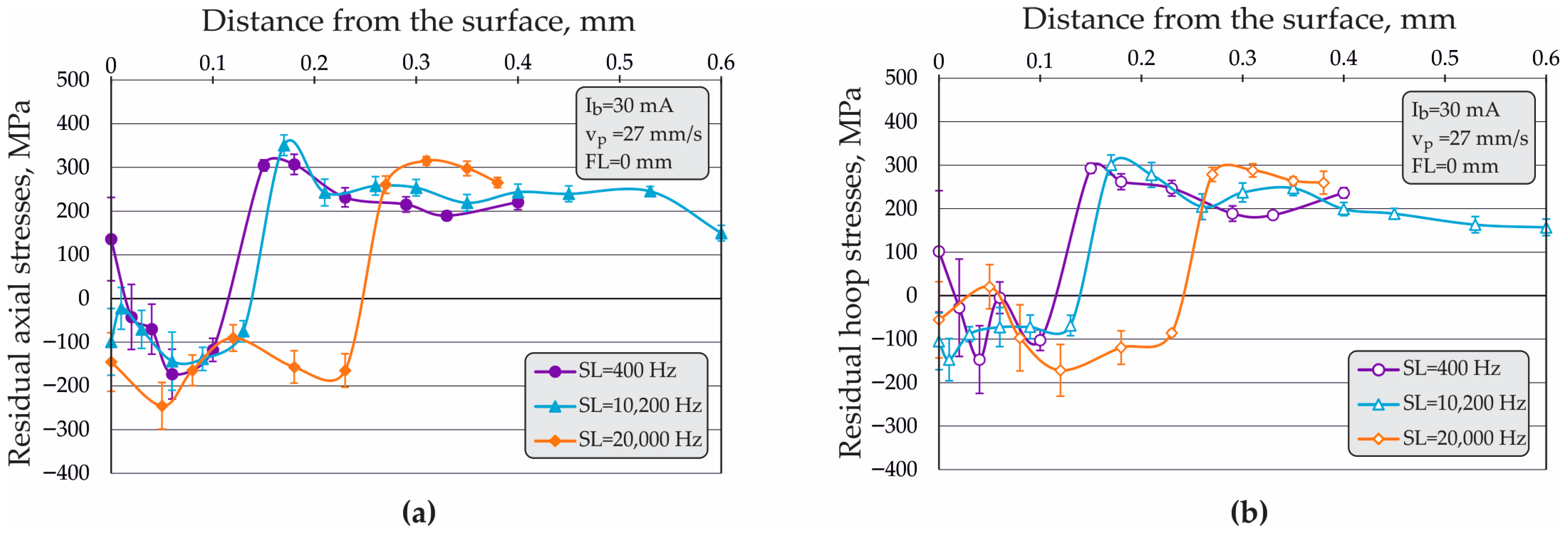 The influence of the SF on the distribution of axial and hoop RSs is shown in depth in Figure 9a,b, respectively. Similar trends were observed in the profiles of both types of RS: the increase in SF was reflected in a greater compression zone depth. At constant values of the other three operating parameters, the EBH implementation with the highest SF of 20,000   H z led to maximum axial and hoop RSs and significantly increased the compressive zone depth to approximately 0.25 mm.