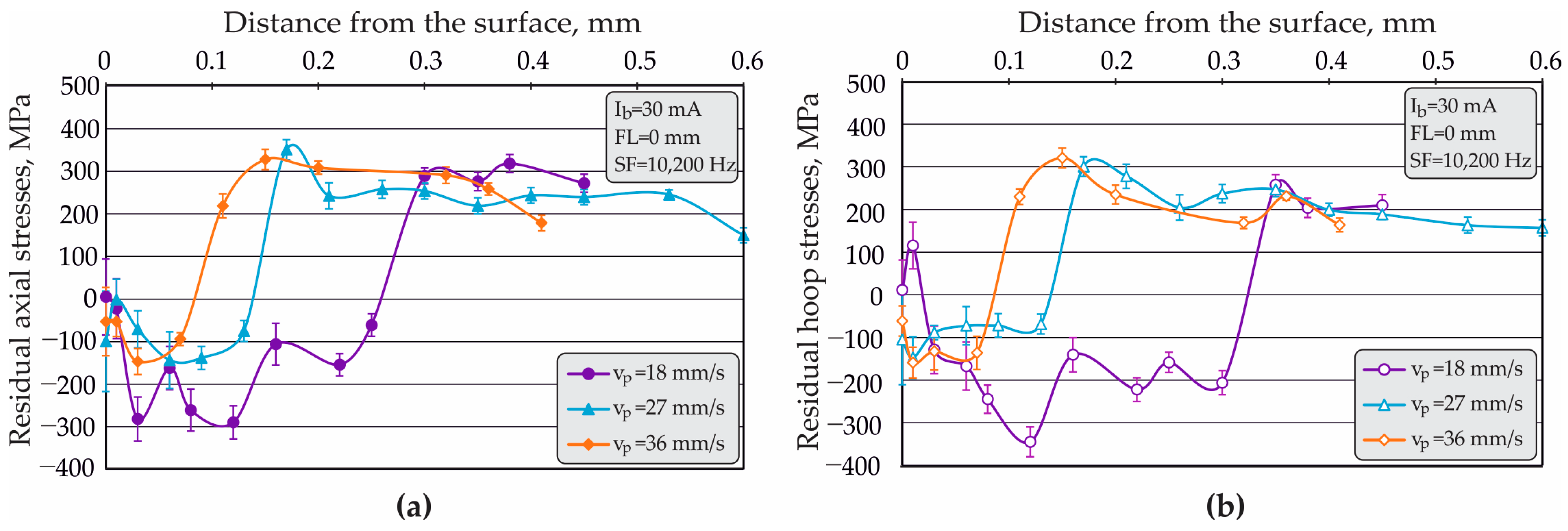 Increasing the v p and thus decreasing the duration of the EBH process significantly changed the RS profile and reduced the depth of the compressive zone for both types of RS. Regardless of the presence of small tensile surface stresses (Figure 6), the implementation of EBH with the smallest peripheral velocity ( v p = 18 mm/s) maximized the axial compressive RS (the maximum absolute value was 289.5   M P a ; Figure 7a), the hoop compressive RS (the maximum absolute value was 345   M P a ; Figure 7b), and the depth of the compressive zone for both types of RS to approximately 0.3 mm. Conversely, the workpiece peripheral velocities of v p = 27 and 36   m m / s significantly reduced the maximum RS and the depth of the compressive zone to approximately 0.15 and 0.09 mm, respectively.