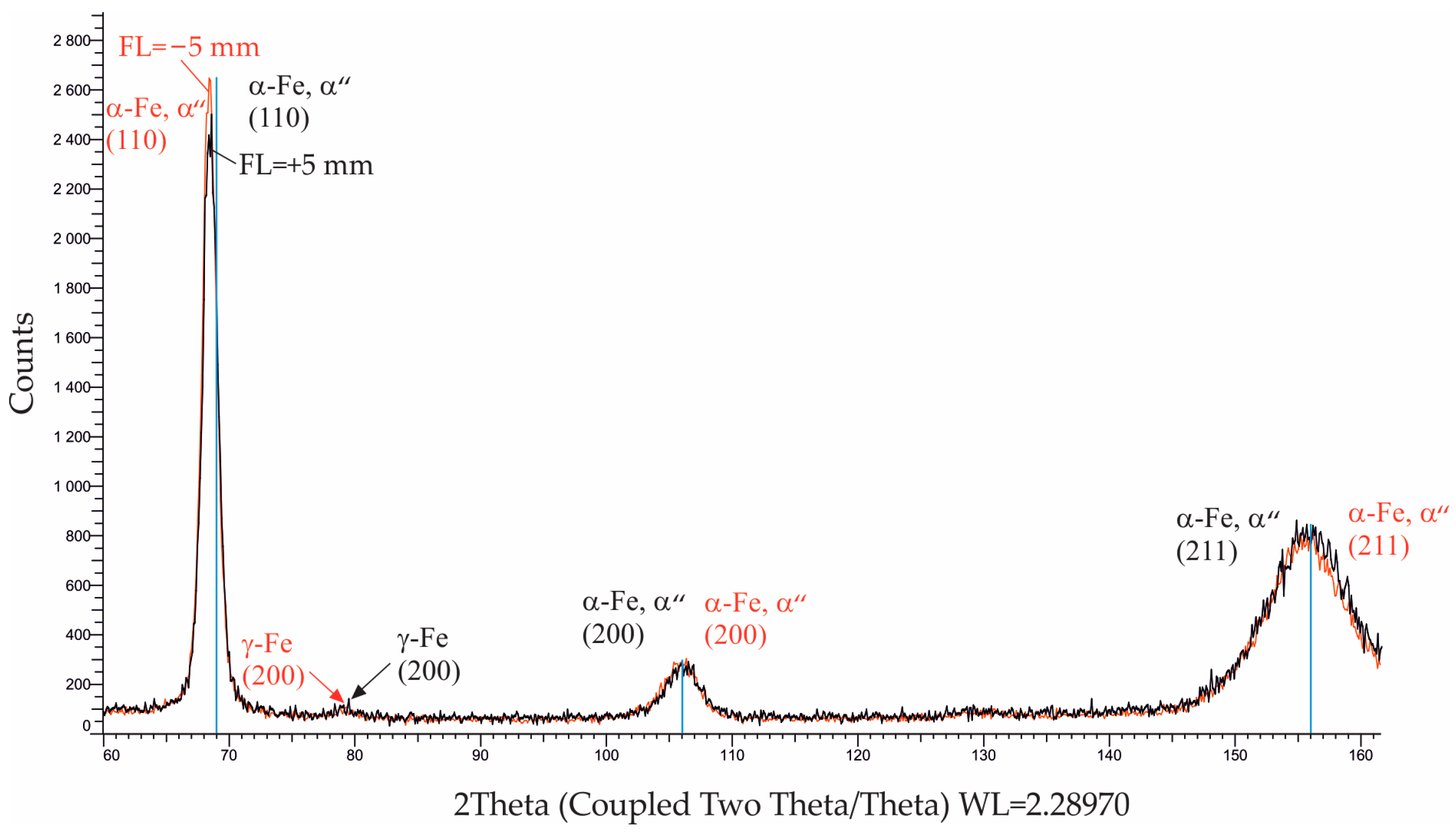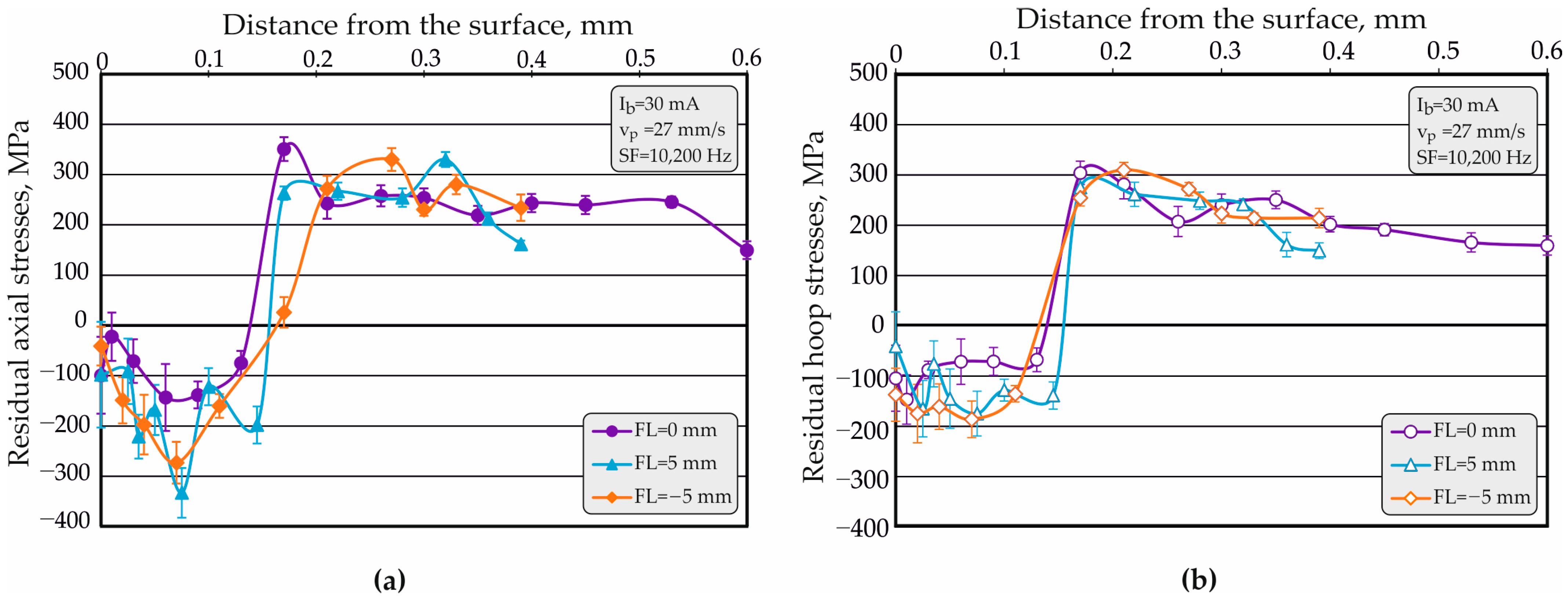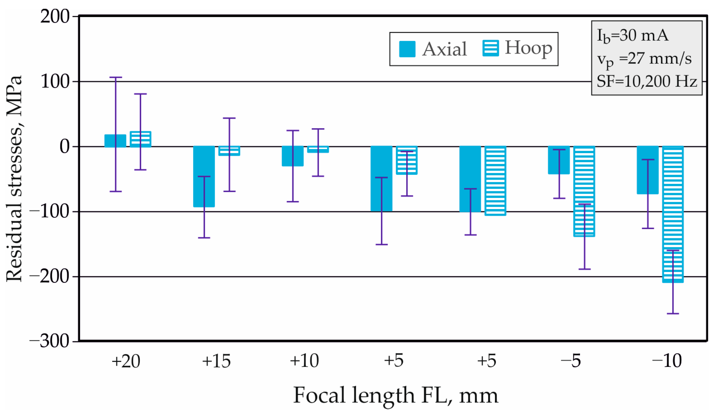 Figure 11a,b visualizes the influence of the FL on the distribution of axial and hoop RSs when the FL was varied in the symmetric interval from FL = + 5   to 5   m m . Generally, a clustering of the obtained profiles of both types of RS was observed. Nevertheless, the implementation of EBH with F L = + 5 and 5   m m led to larger absolute values of the axial (Figure 11a) and hoop compressive RSs (Figure 11b). Additionally, the profiles of both types of RS formed smoother curves when the focal spot was below the surface (FL was negative), probably due to the less pronounced temperature gradient.