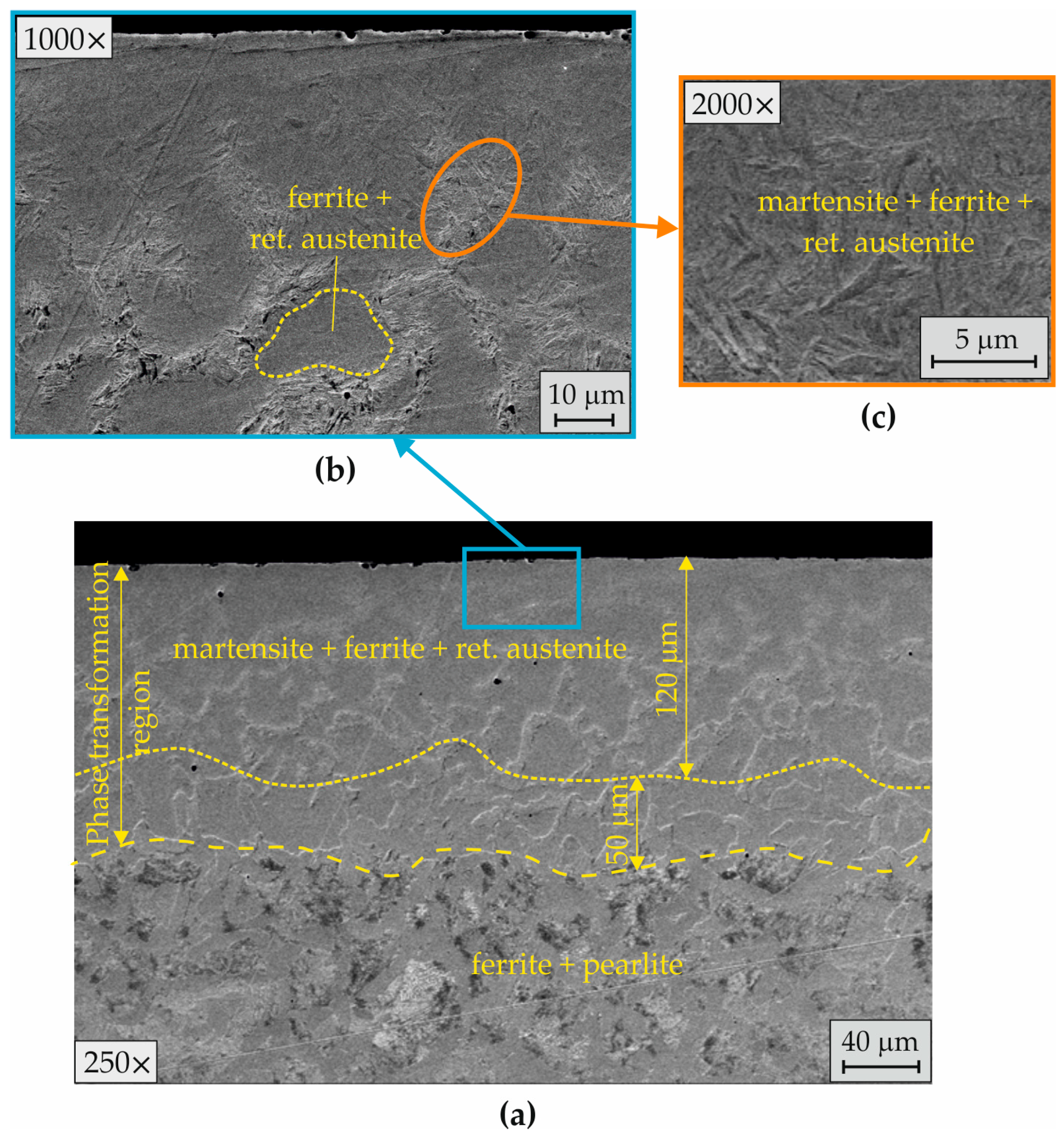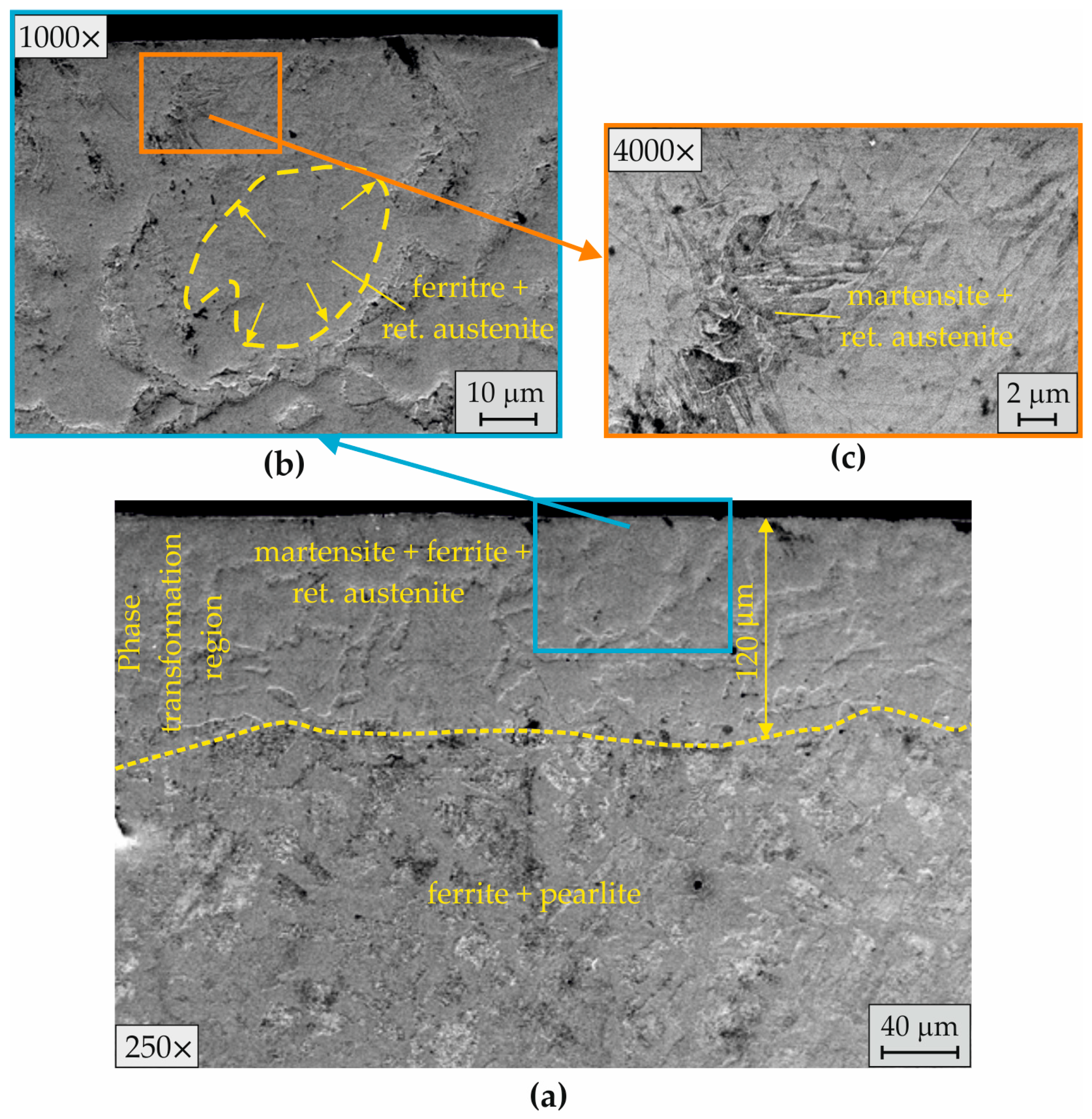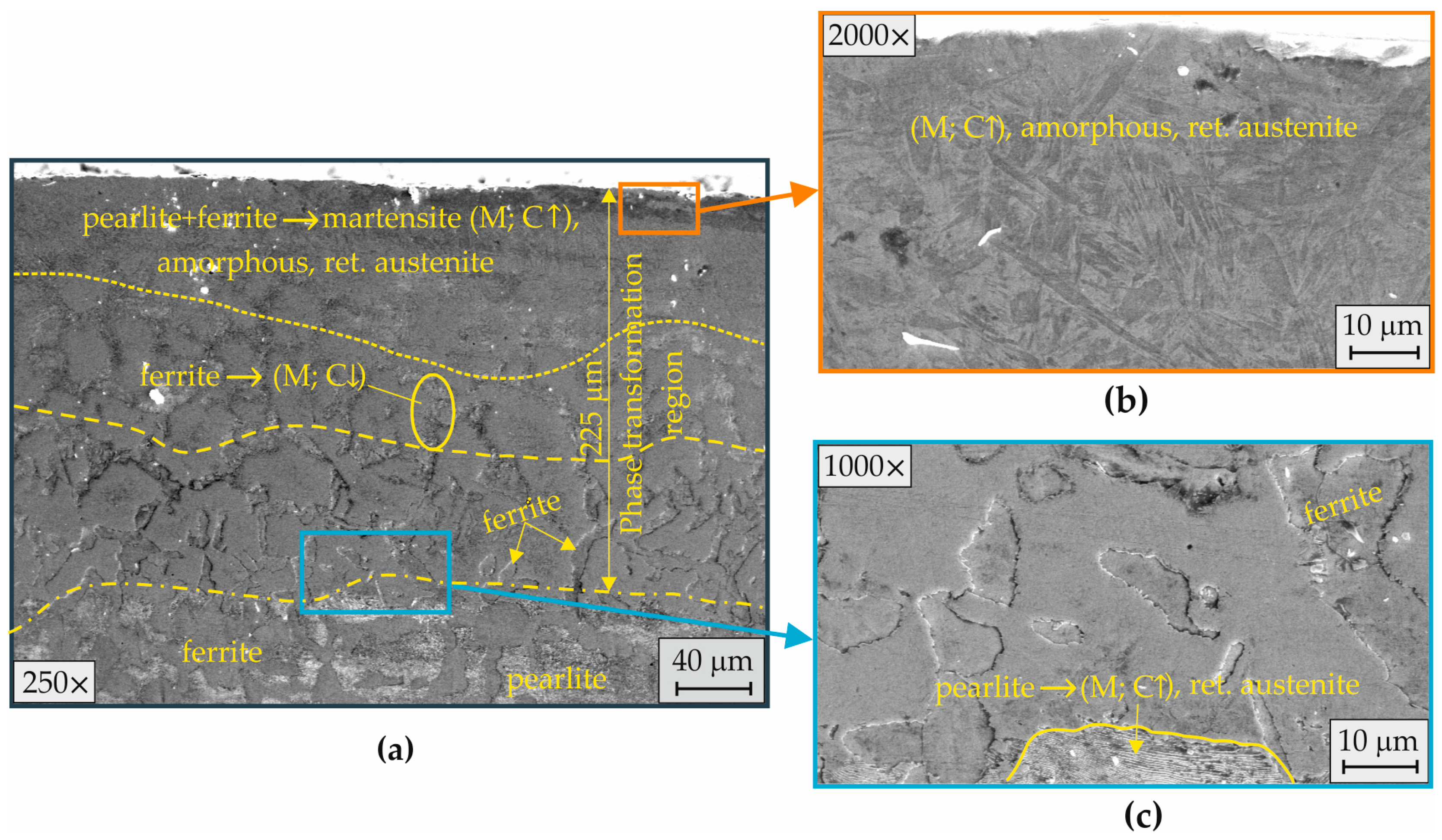 The EBH implementation with a smaller electron beam current ( I b = 16.5   m A ) caused structural and phase changes at a depth of approximately 20 μm (Figure 13a). The short time and high temperature gradient prevented complete crystallization. Consequently, amorphous grains were formed in the liquid-solid regions at the liquid-solid transition, and the structure was inhomogeneous. The heating time and lower pearlite transformation temperature (727 °C) favoured the pearlite → austenite phase transformation in the pearlite colonies. As a result of the phase transformations ferrite → austenite → ferrite and the higher ferrite transformation temperature (911 °C), ferrite was preserved in the thermally affected SL, with low-carbon martensite (M; C↓) being registered (Figure 13b). Additionally, pearlite melted more easily than ferrite. Consequently, a mixture of liquid and solid phases was obtained in the SL, with the solid austenite phase undergoing a phase transformation to martensite. The high carbon content in the resulting martensite partially blocked the austenite → martensite (M; C↑) transformation and thus some retained austenite was obtained near the surface (Figure 13b).