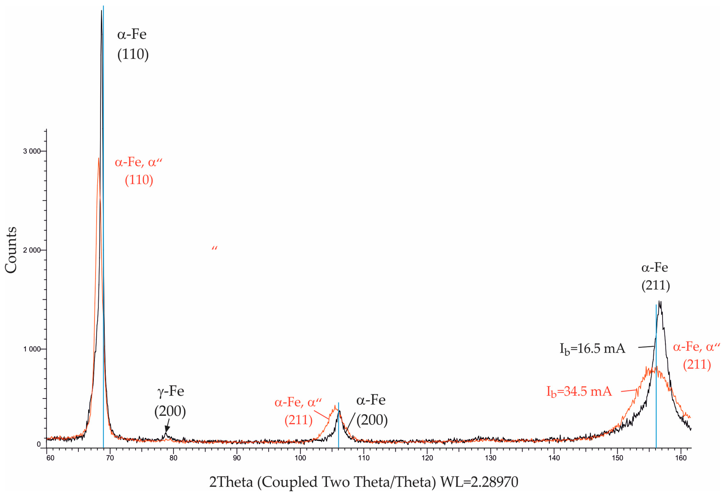 The smaller electron beam currents ( I b = 12   and 16.5   m A ) led to large surface tensile axial and hoop RSs (Figure 4). These RSs were caused by the dominance of the high temperature gradient and very rapid solidification rates. The EBH implementation with the electron beam current in the interval I b ( 21 , 34.5 )   m A increased the amount of heat introduced into the treated surface per unit time. The resulting thermal cycles favoured martensitic transformation, which has a larger volume than the parent structure [29,49]; consequently, compressive RSs were generated. The phase inhomogeneity near the surface was reflected in greater scattering of the measured RS.