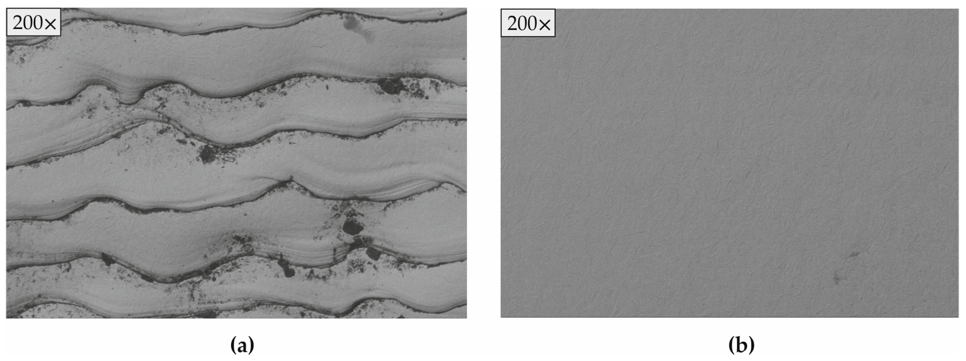 Figure 19. Surface morphology depending on scanning frequency: (a) S F = 400   H z ; (b) S F = 20,000   H z .
